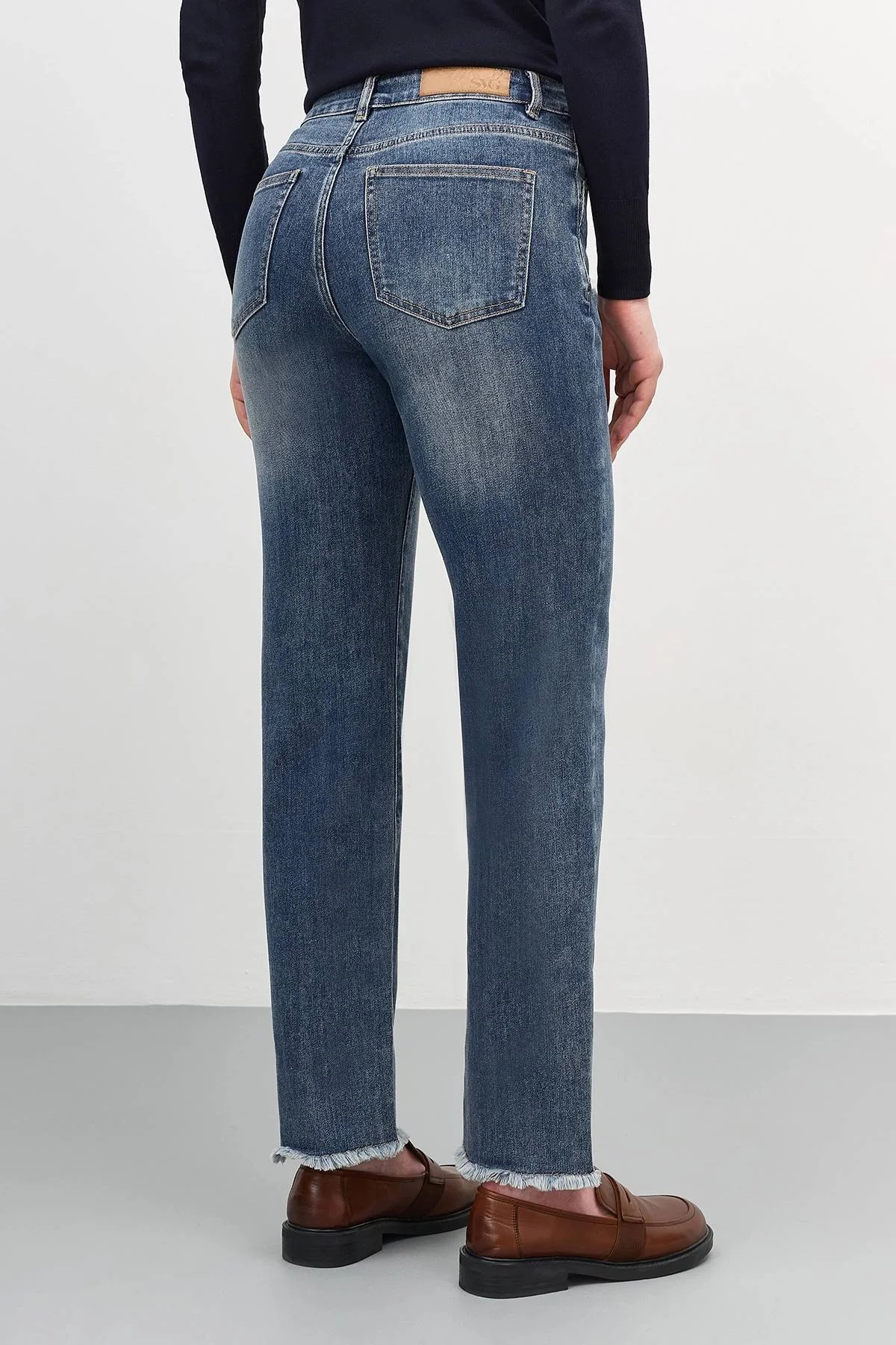 Джинсы с деликатной варкой и бахромой. Прямой силуэт заужен к низу. Застежка на молнию и металлическую пуговицу. Пять карманов. Вход в боковые карманы в швах. В составе спандекс.
