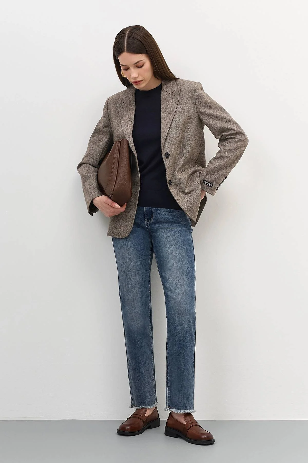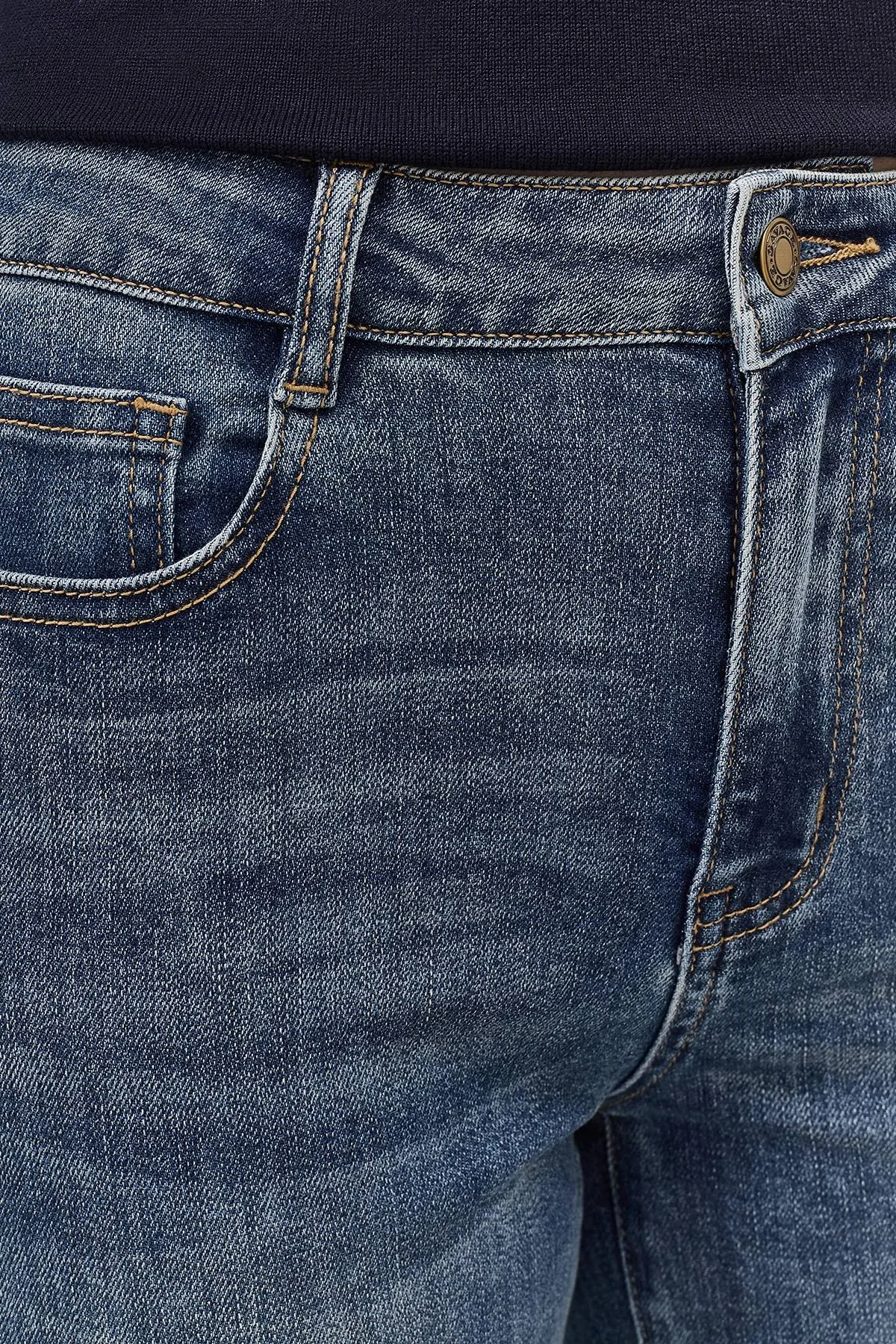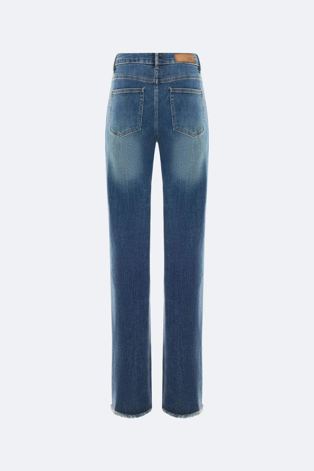 Джинсы с деликатной варкой и бахромой. Прямой силуэт заужен к низу. Застежка на молнию и металлическую пуговицу. Пять карманов. Вход в боковые карманы в швах. В составе спандекс.