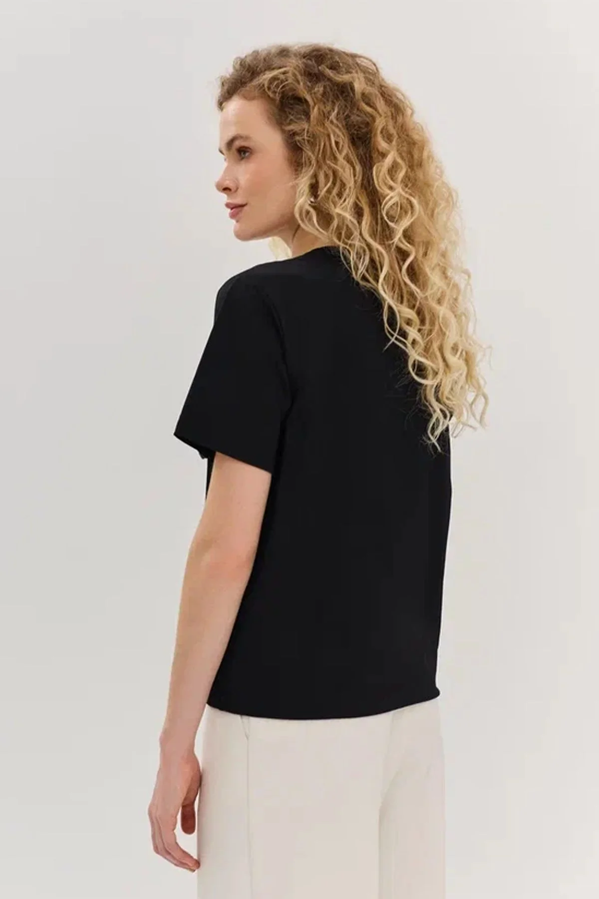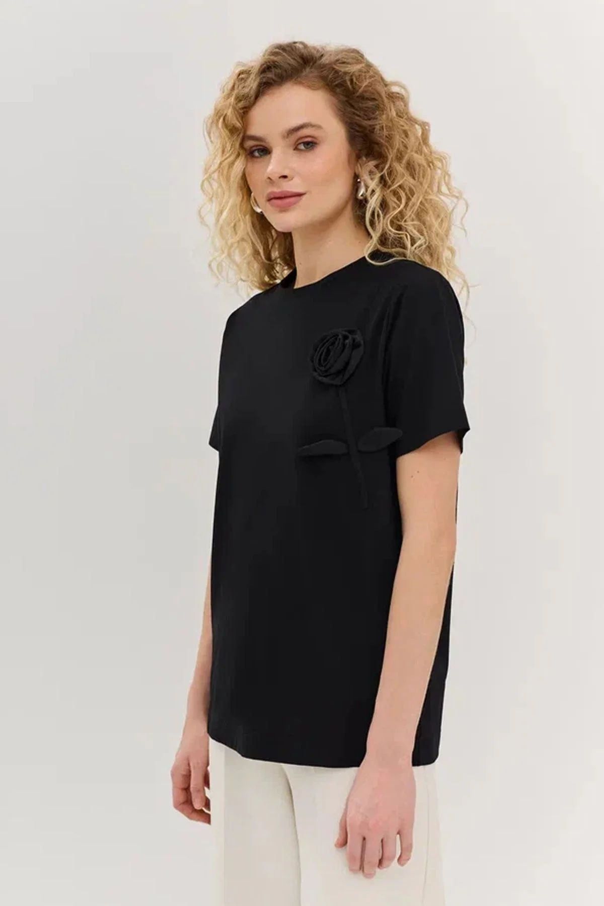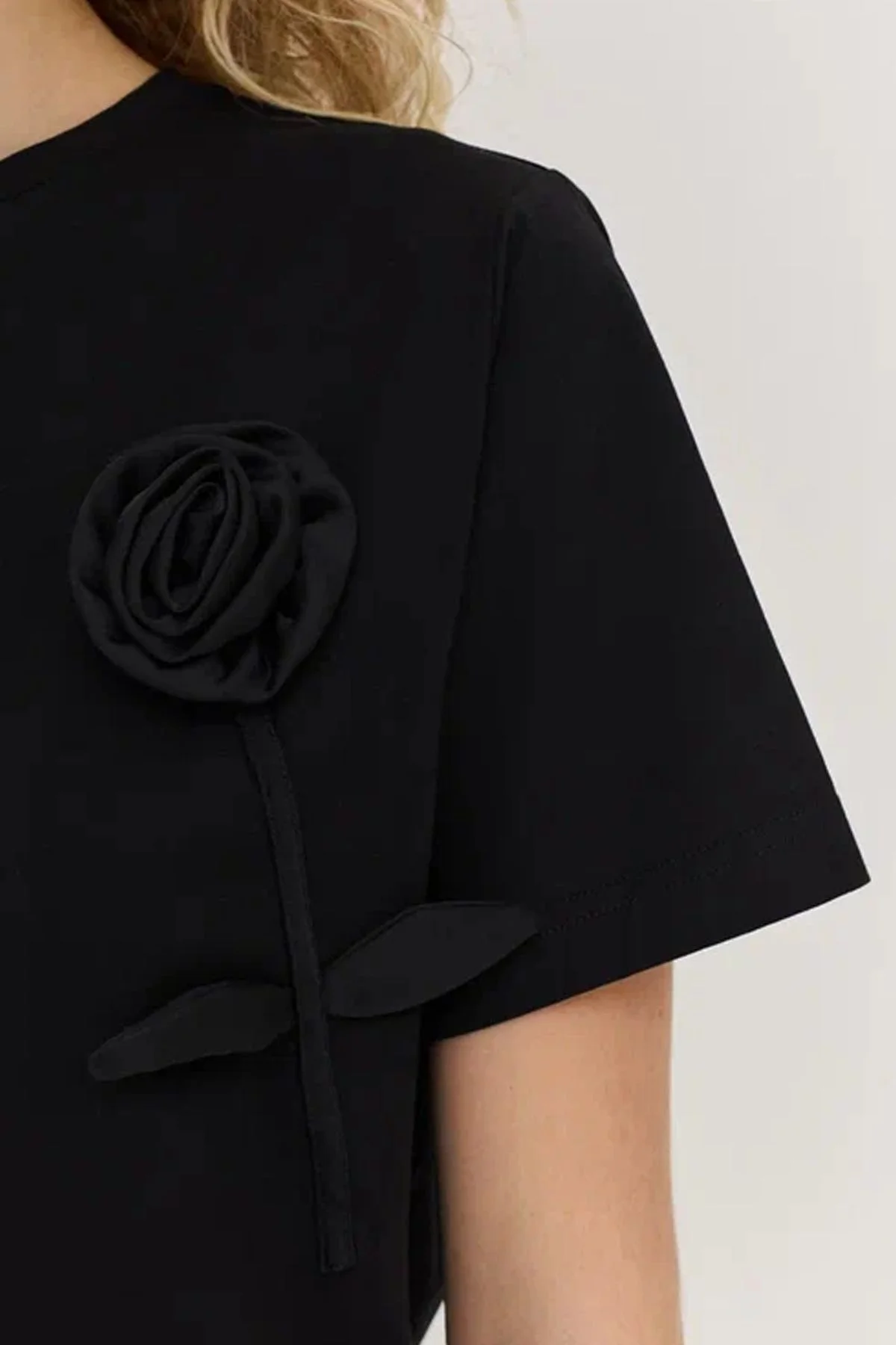Футболка чёрного цвета с объёмным цветочным элементом. Короткие рукава и круглый вырез горловины комфортно ощущаются в тёплую погоду. Объёмный цветок на полочке - интересный декоративный элемент. Данную футболку можно сочетать с различными позициями гардероба и аксессуарами.