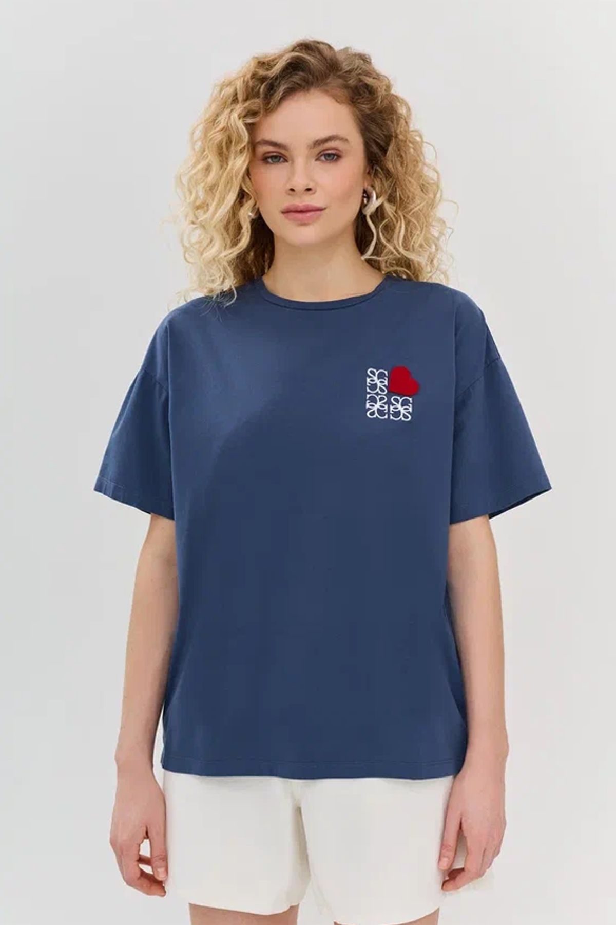 Футболка из эластичного хлопка с яркой вышивкой в темно-синем цвете, 50р