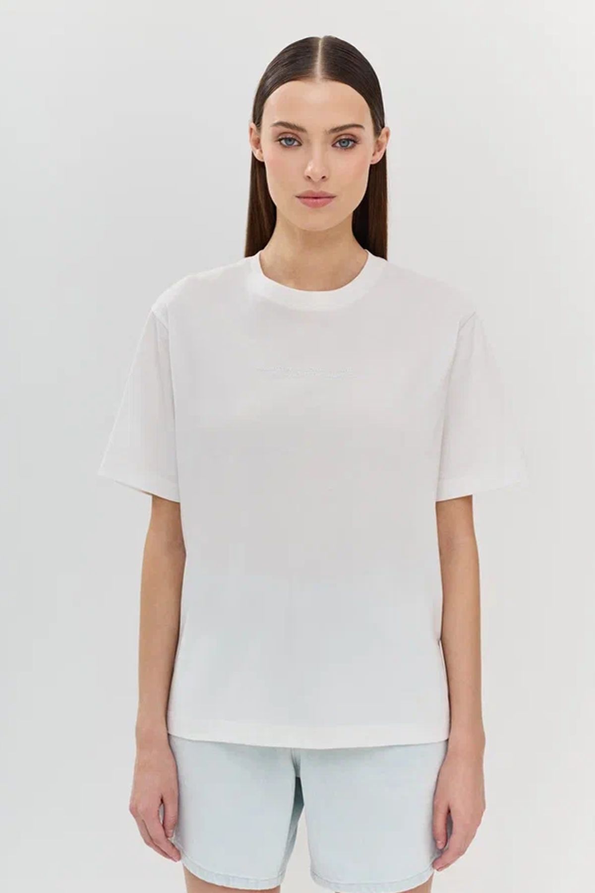 Хлопковая футболка с деликатным объёмным декоративным элементом на полочке. За счёт материала ткань прекрасно обеспечивает терморегуляцию тела. Короткие рукава и круглый вырез горловины комфортно ощущаются в тёплую погоду. Данную модель можно сочетать с различными вариантами низа.