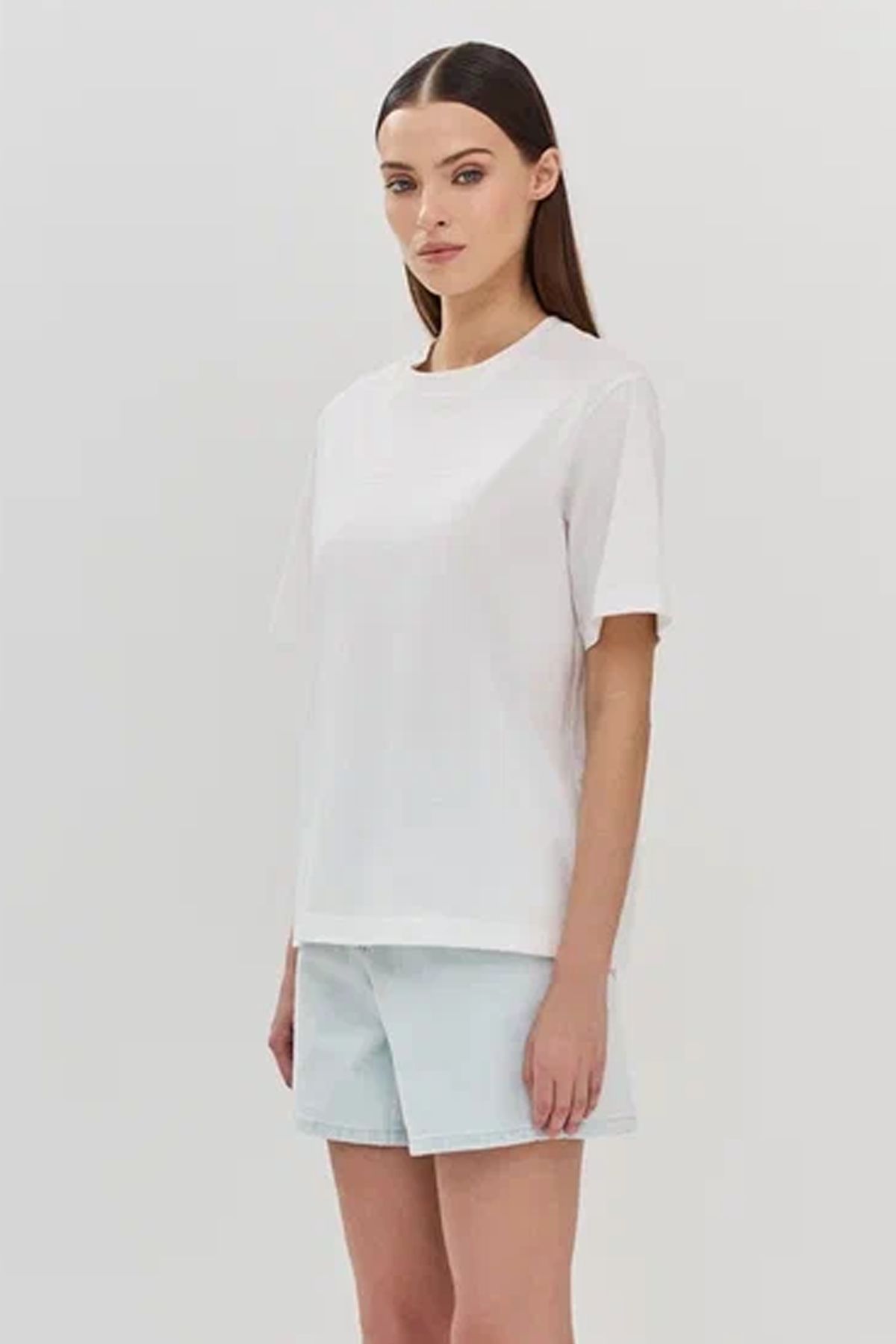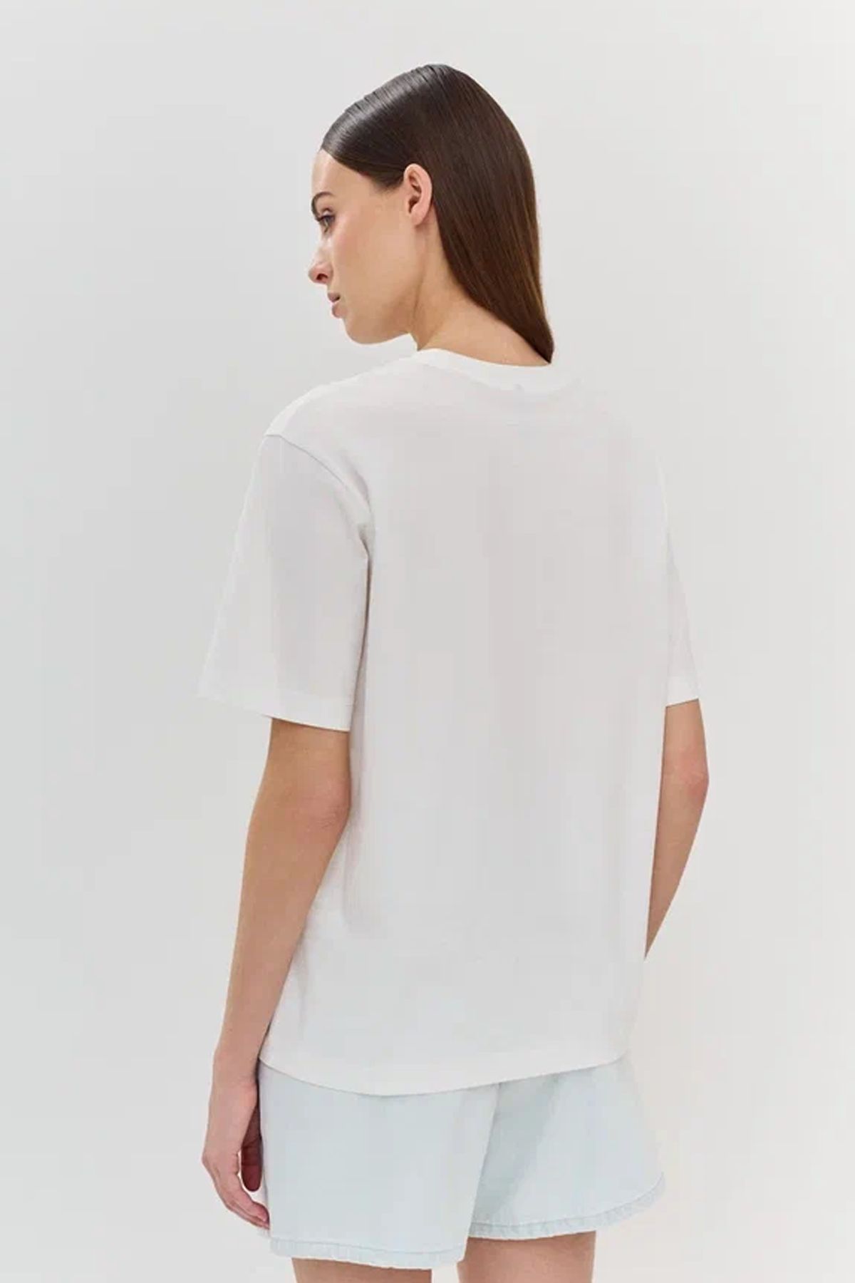 Хлопковая футболка с деликатным объёмным декоративным элементом на полочке. За счёт материала ткань прекрасно обеспечивает терморегуляцию тела. Короткие рукава и круглый вырез горловины комфортно ощущаются в тёплую погоду. Данную модель можно сочетать с различными вариантами низа.