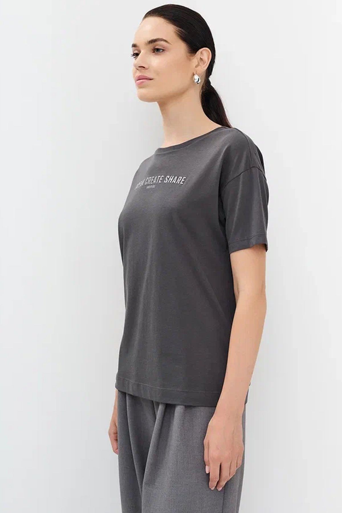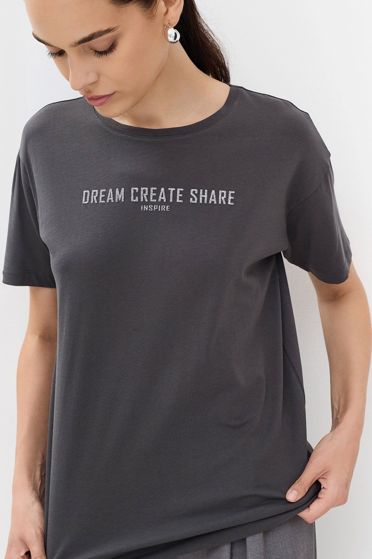 Футболка из хлопкового трикотажа с текстовым принтом. Короткие рукава и круглый вырез горловиины комфортно ощущаются в летний период. Прямой крой подойдёт практически на любой тип фигуры. Текстовый принт "DREAM CREATE SHARE. INSPIRE" (с англ. "МЕЧТАЙ СОЗДАВАЙ ДЕЛИСЬ. ВДОХНОВЛЯЙ). Данная модель особенно хорошо будет сочетаться с различными видами джинсов.