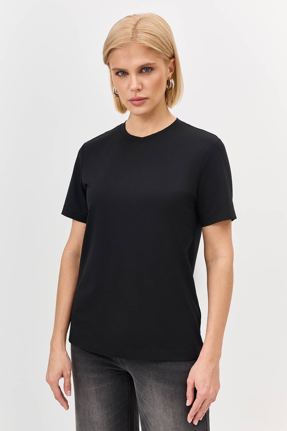 Классический прямой силуэт с круглым вырезом создает универсальную основу для повседневного гардероба. Мягкая смесовая ткань обеспечивает комфорт и приятные тактильные ощущения.
