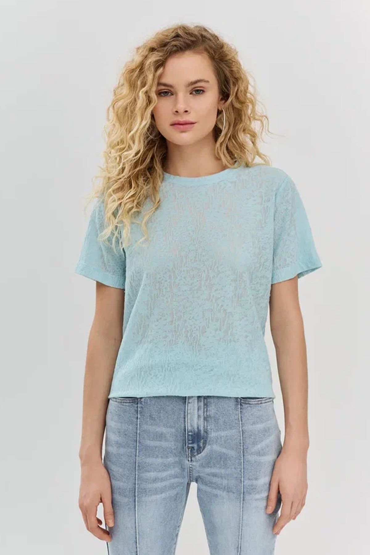 Однотоная футболка голубого цвета из фактурной ткани, 50р