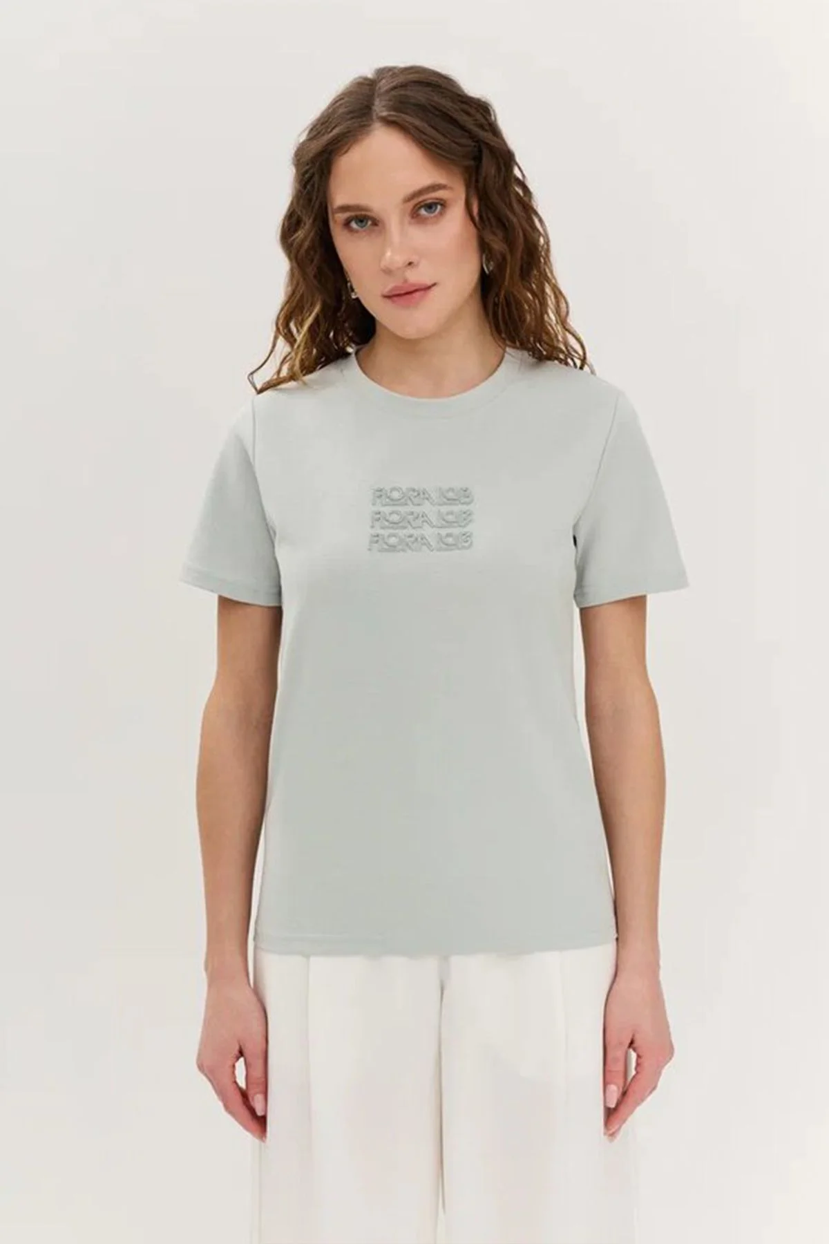 Однотонная футболка серо-голубого цвета с объёмным декором, 52р