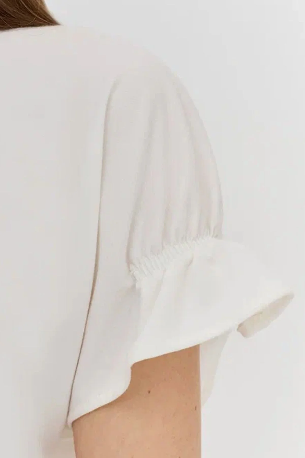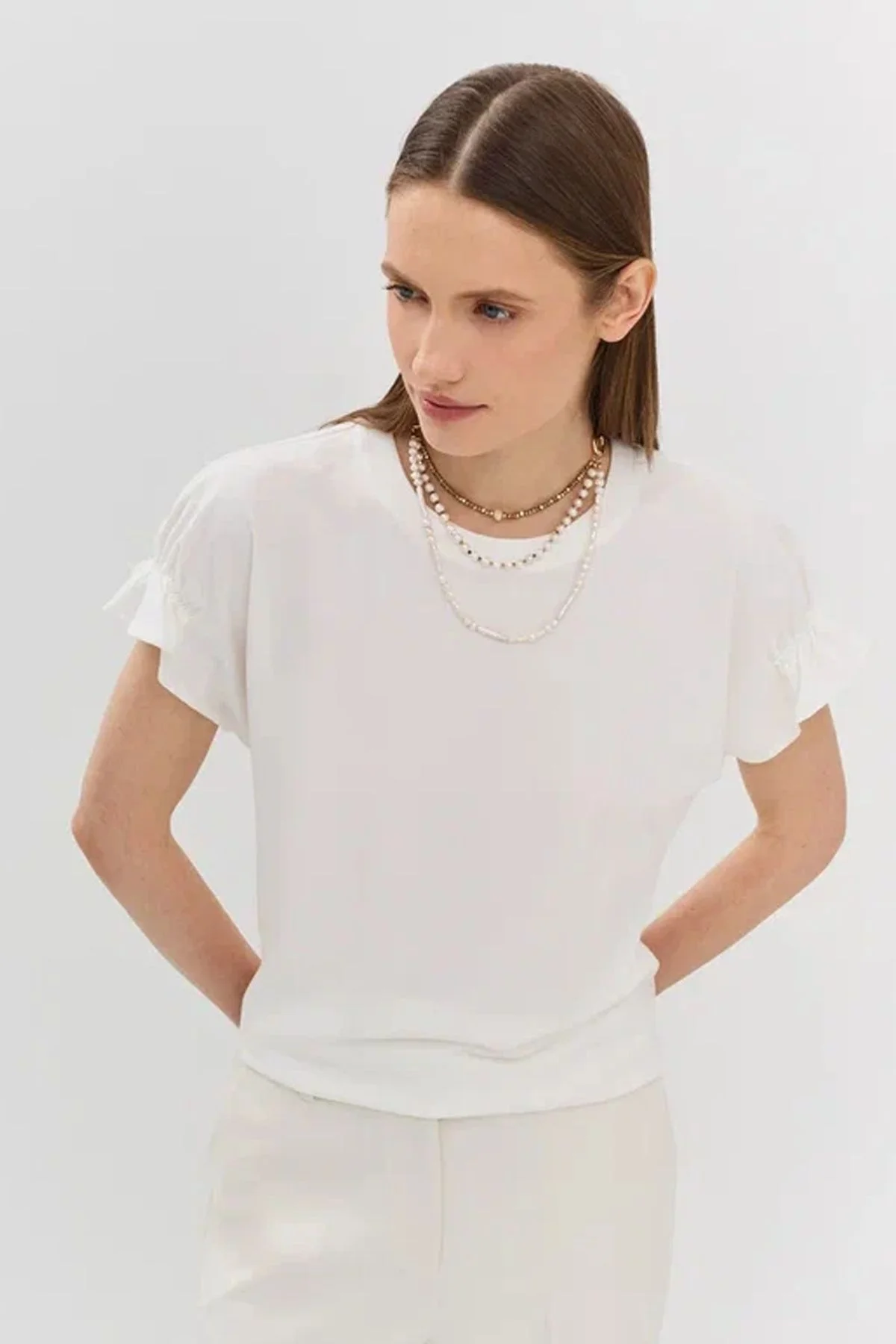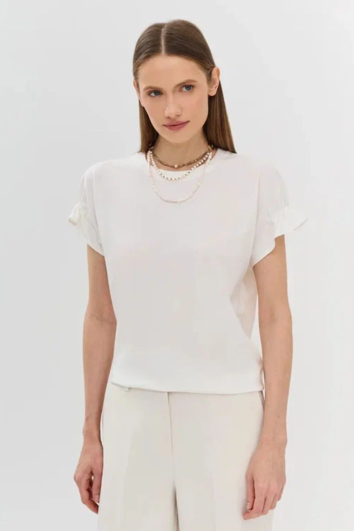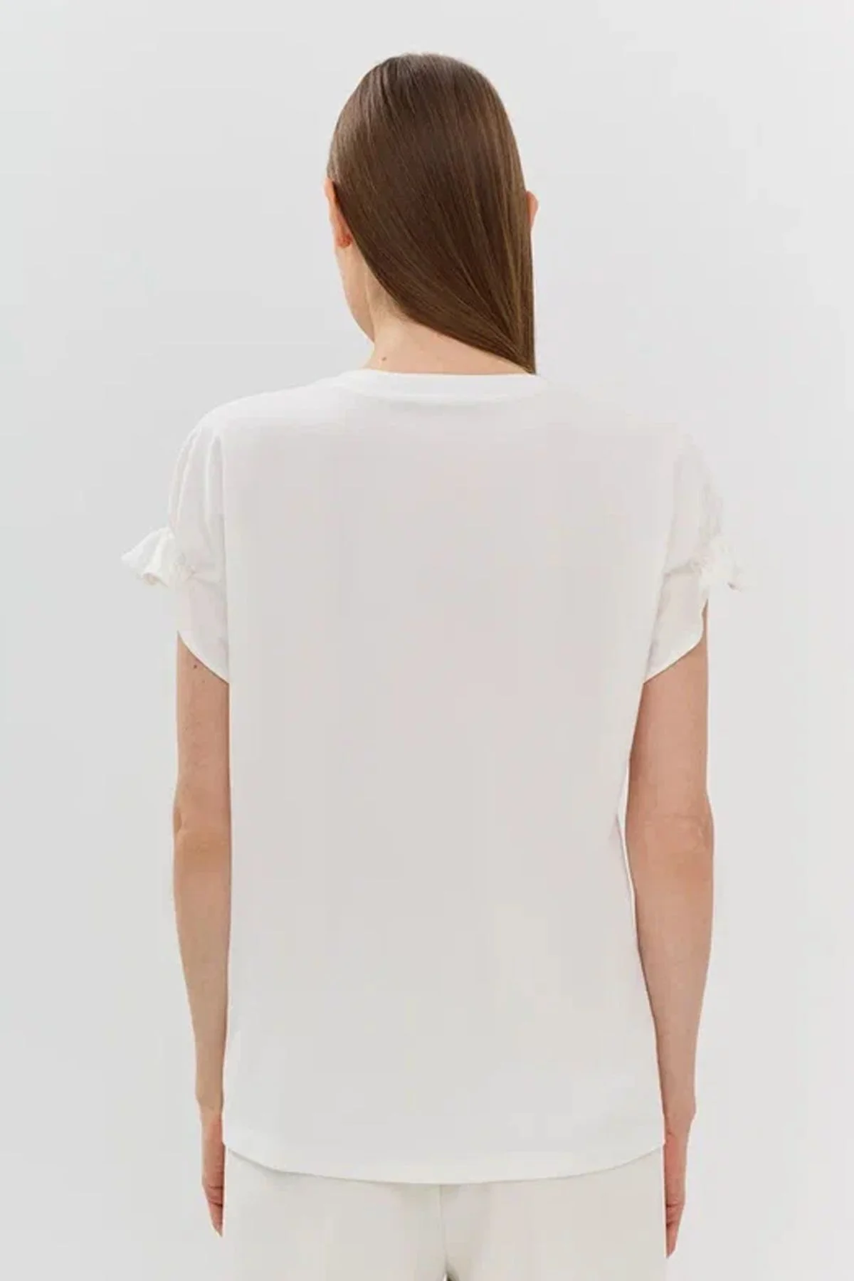 Футболка белого цвета со сборкой по низу рукавов. Полуприталенный силуэт аккуратно подчёркивает фигуру. Круглый вырез горловины и короткий рукав комфортно ощущаются в теплую погоду. Данная модель отлично подойдёт для создания романтичных образов.