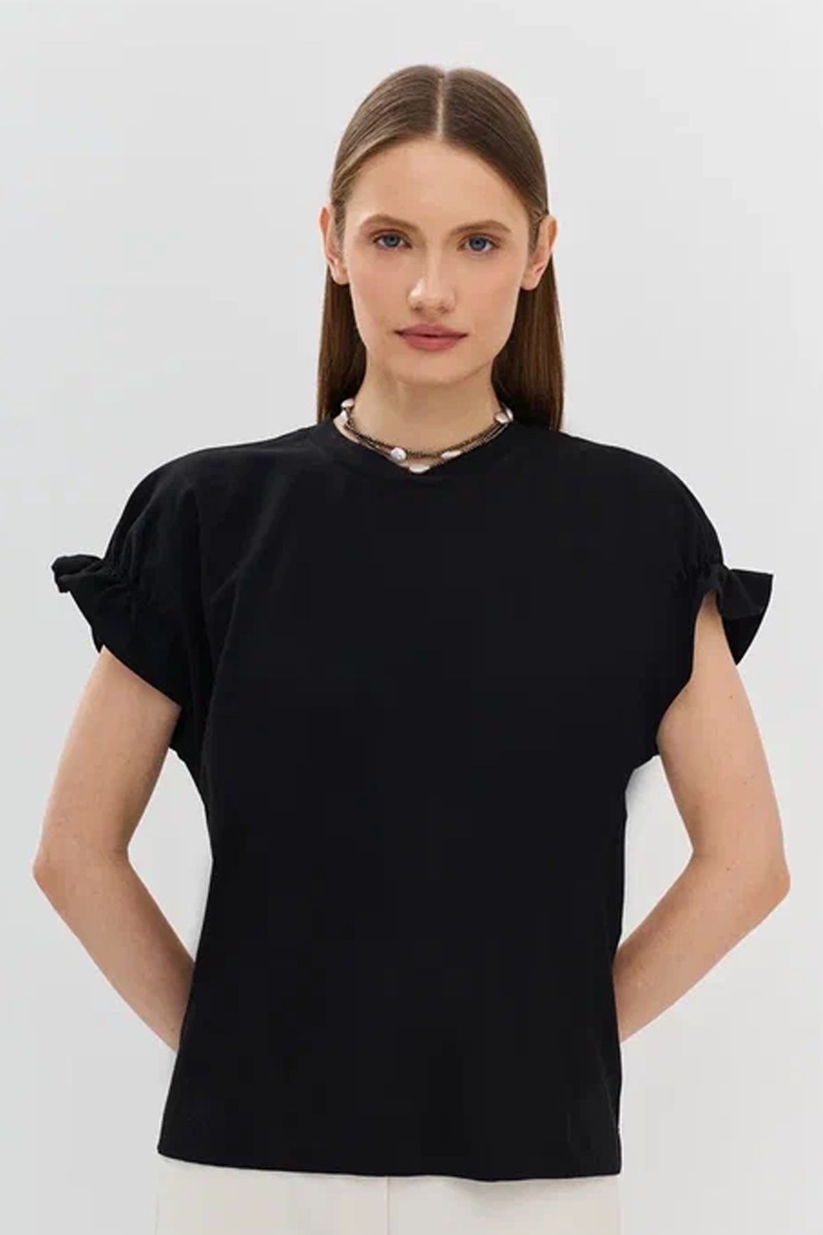 Романтичная футболка со сборкой по низу рукавов в черном цвете, 52р