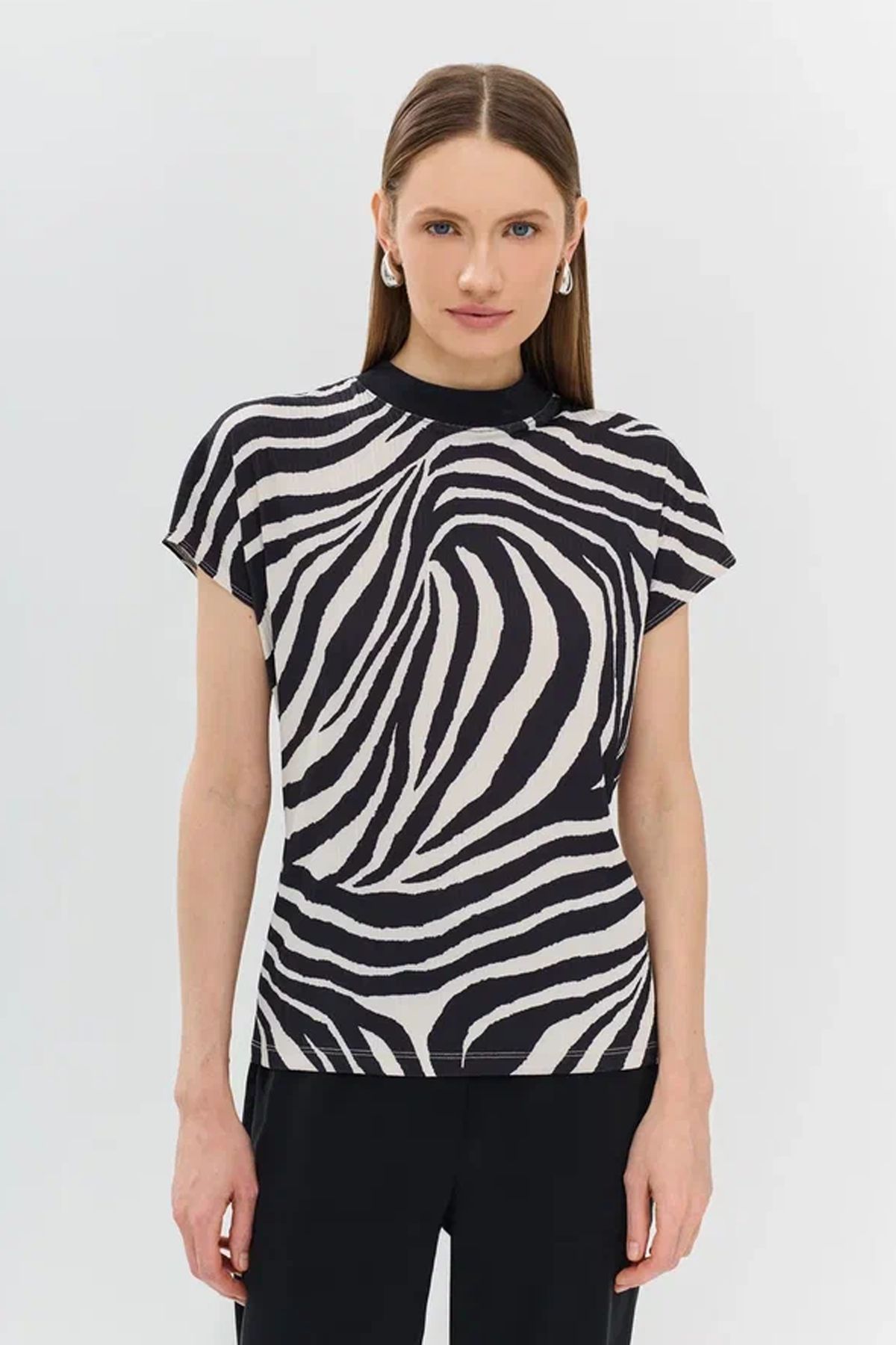 Футболка с анималистичным принтом. Свободный силуэт подойдёт практически на любой тип фигуры. Контрастный высокий риб по горловине. Спущенная линия плеч придаёт образу расслабленности. Данный топ можно сочетать с различными вариантами низа (брюки, юбки, джинсы).