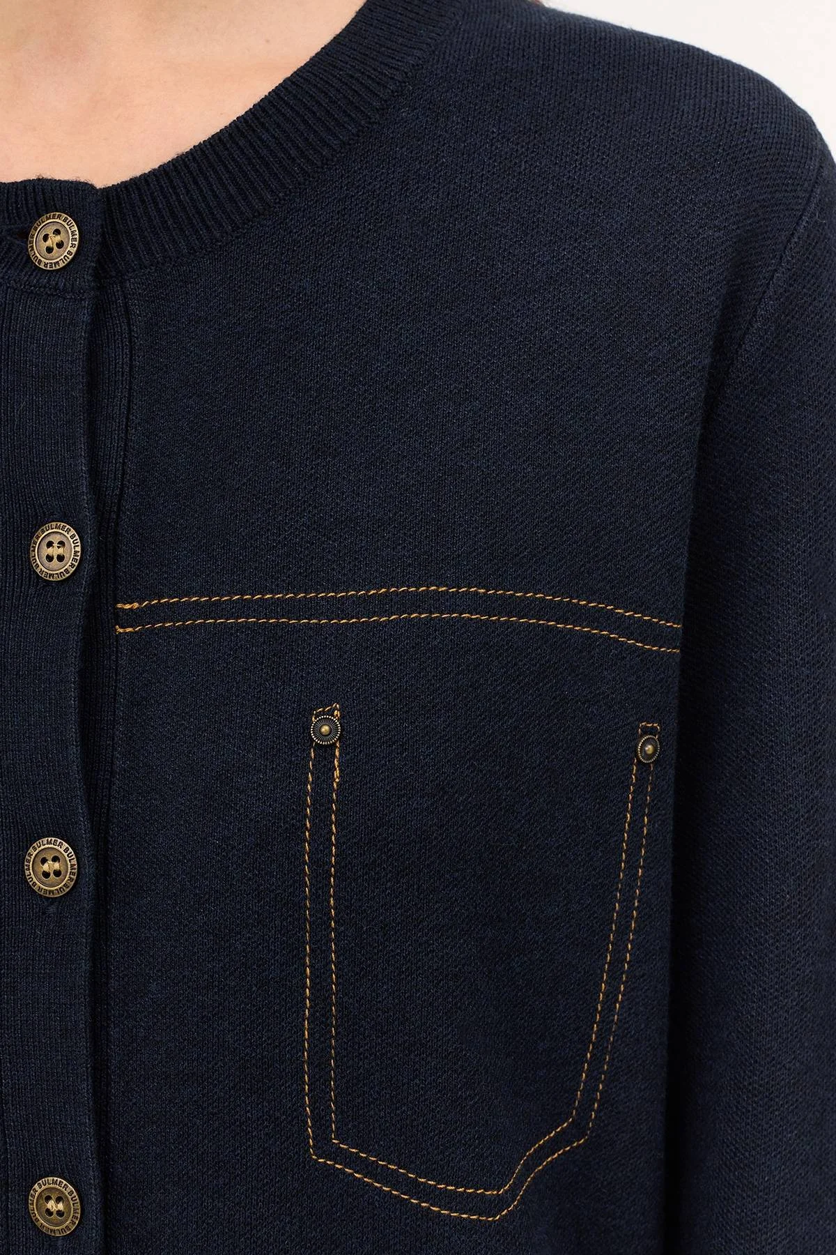 Жакардовый вязаный кардиган с контрастными строчками. Прямой силуэт. Круглый вырез. Застежка на контрастные металлические пуговицы. Имитация нагрудного кармана. В составе шерсть. Комплект с арт. 5257748.