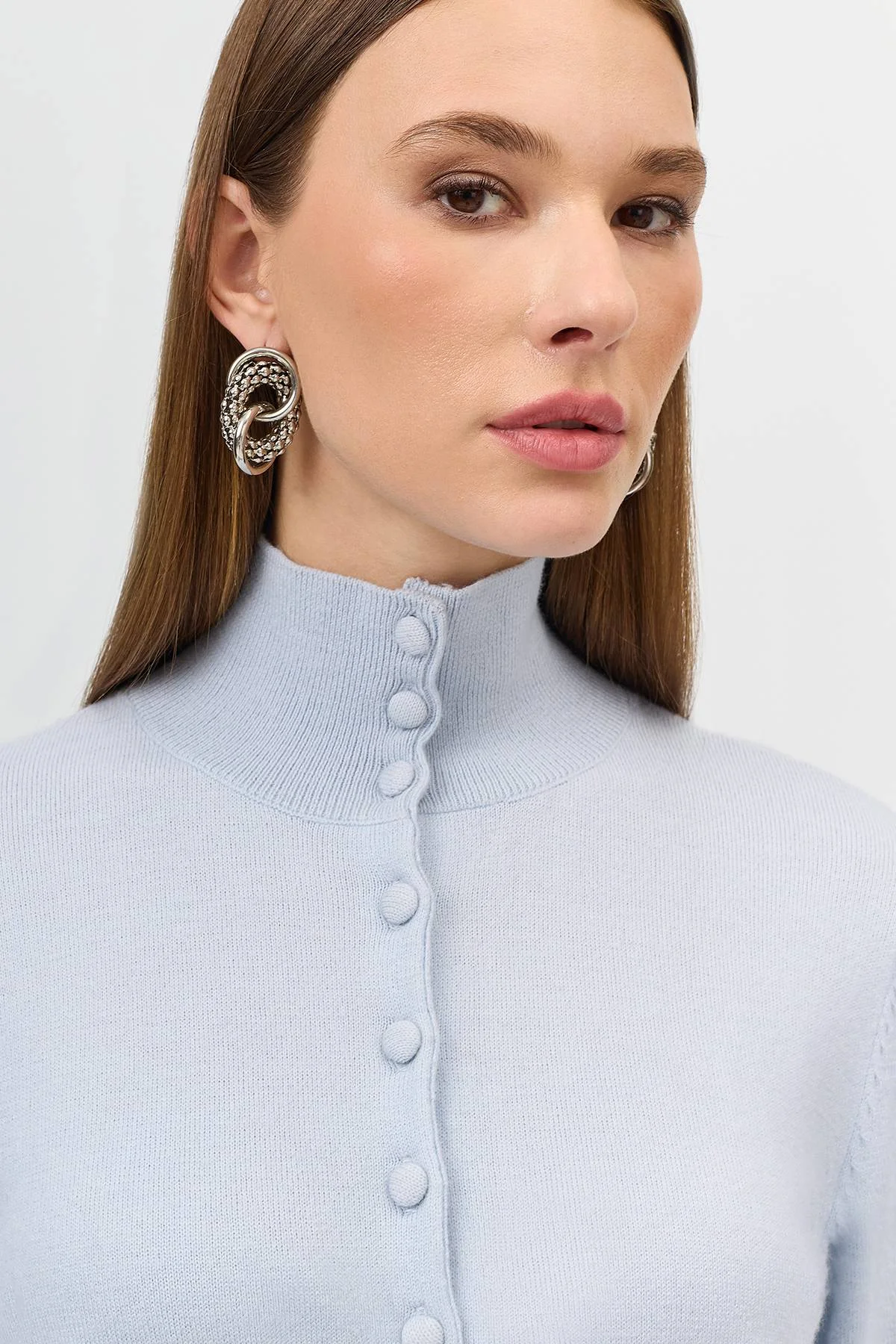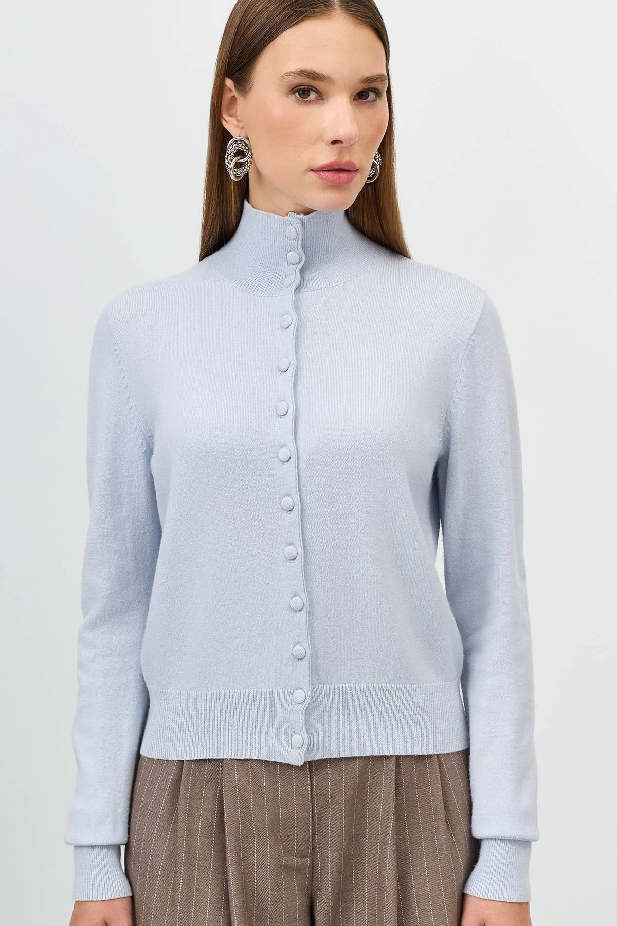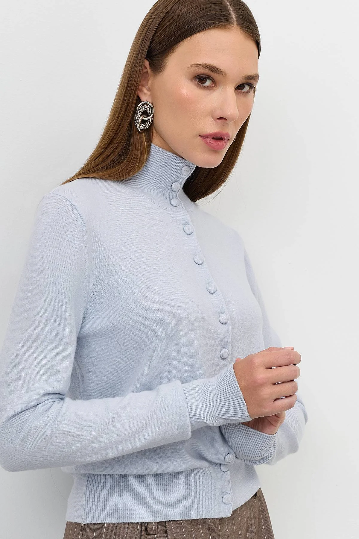 Кардиган прилегающего силуэта из пряжи с добавлением шерсти. Застежка на акцентные пуговицы в цвет.