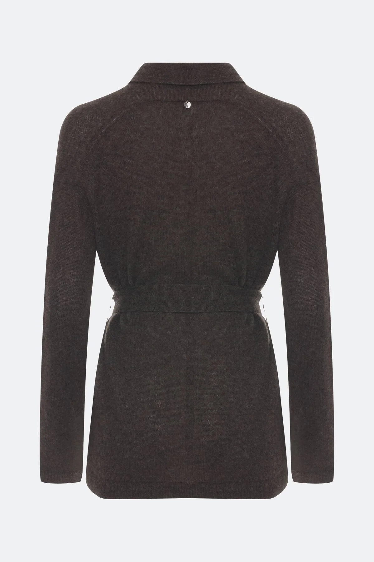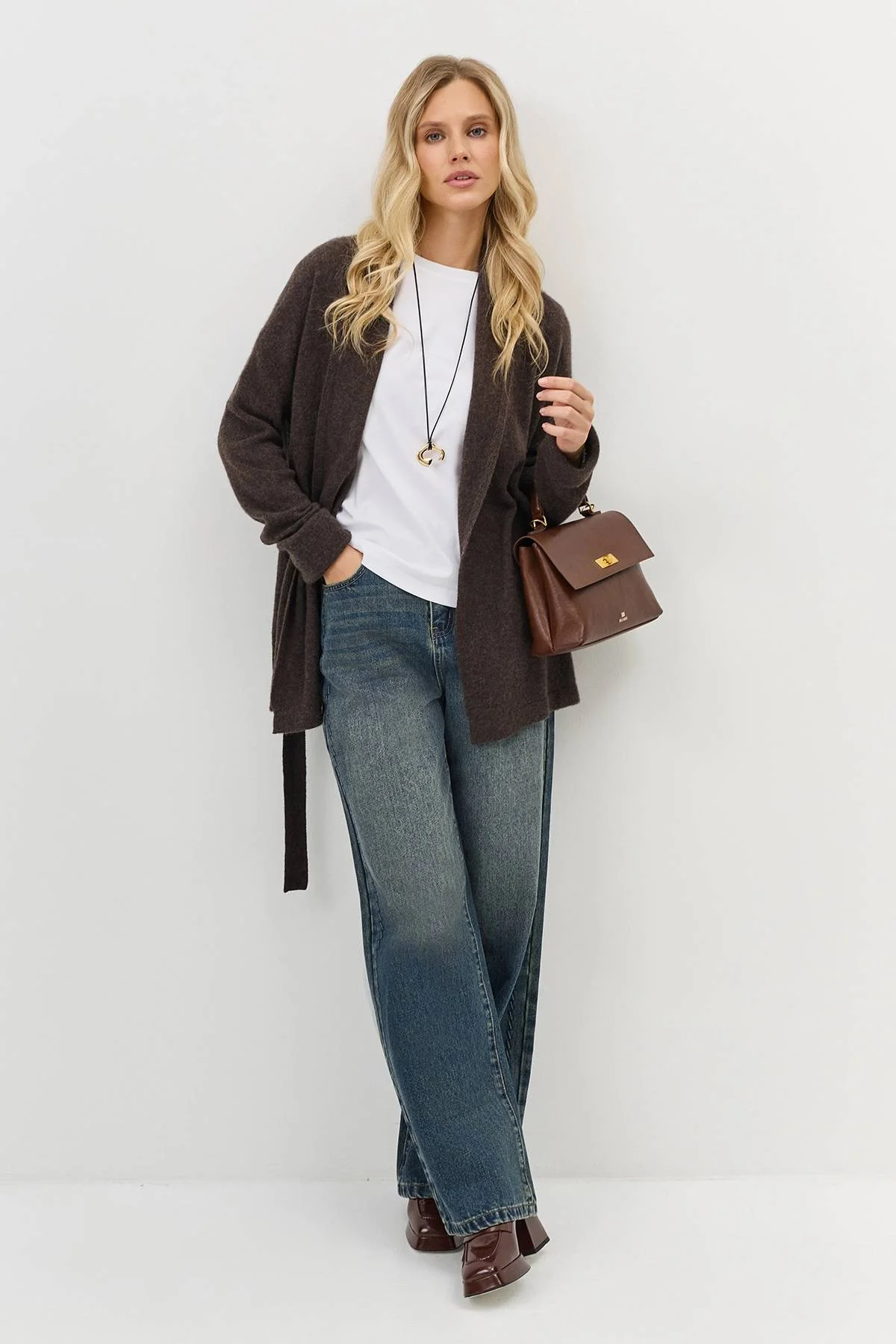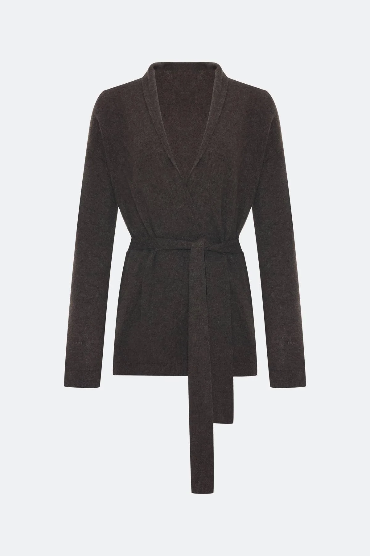 Вязаный кардиган из 100% кашемира. Свободный силуэт можно приталить поясом. Шалевый воротник и V-образный вырез.