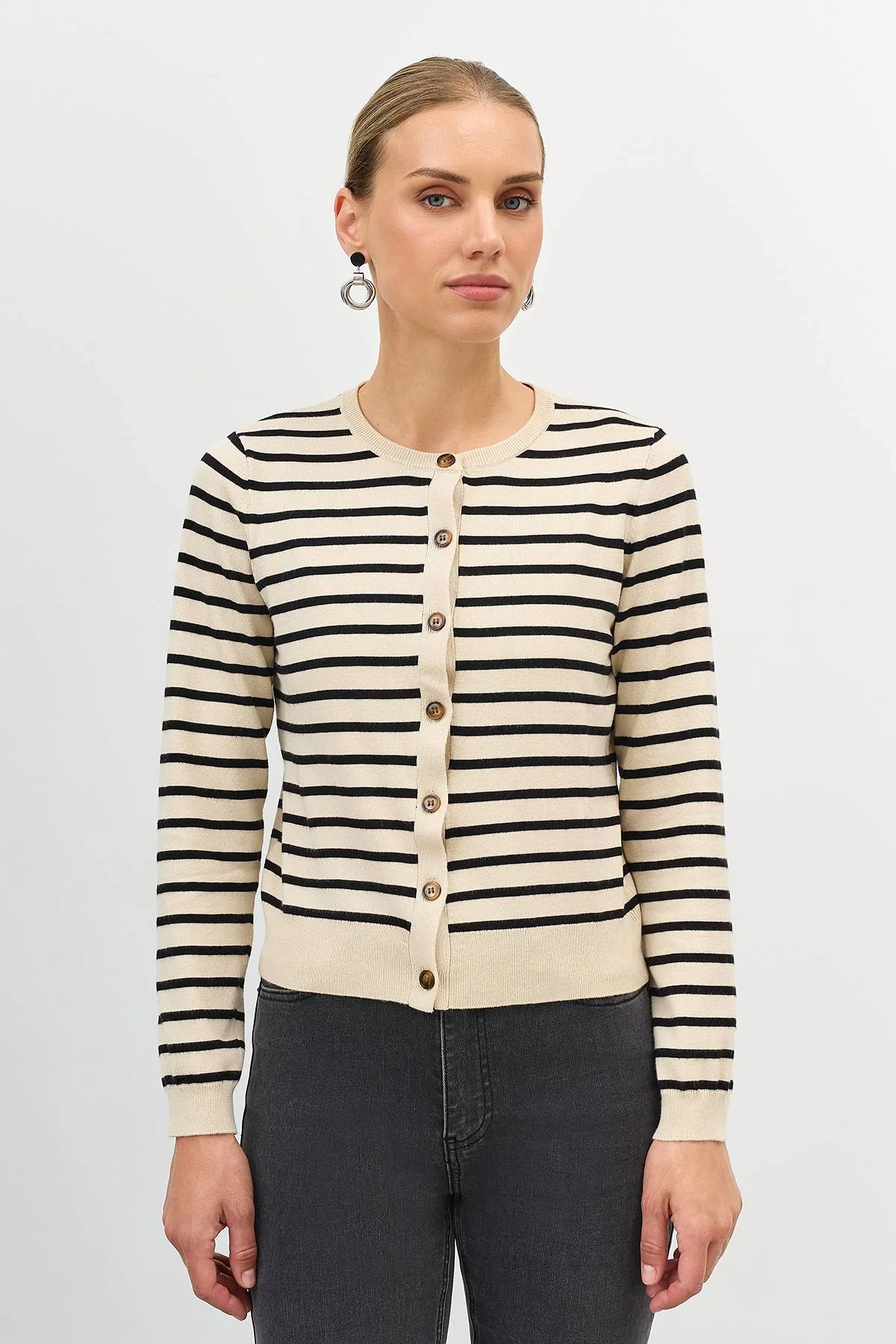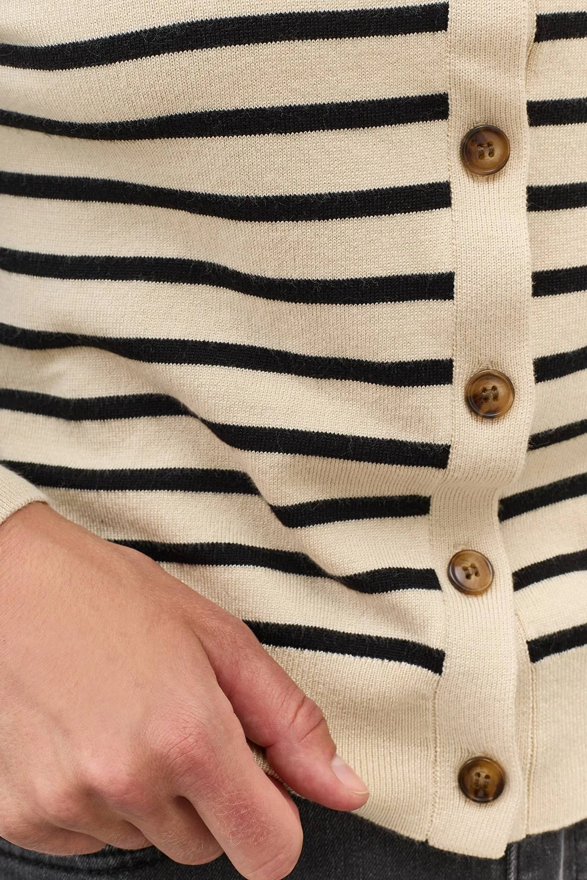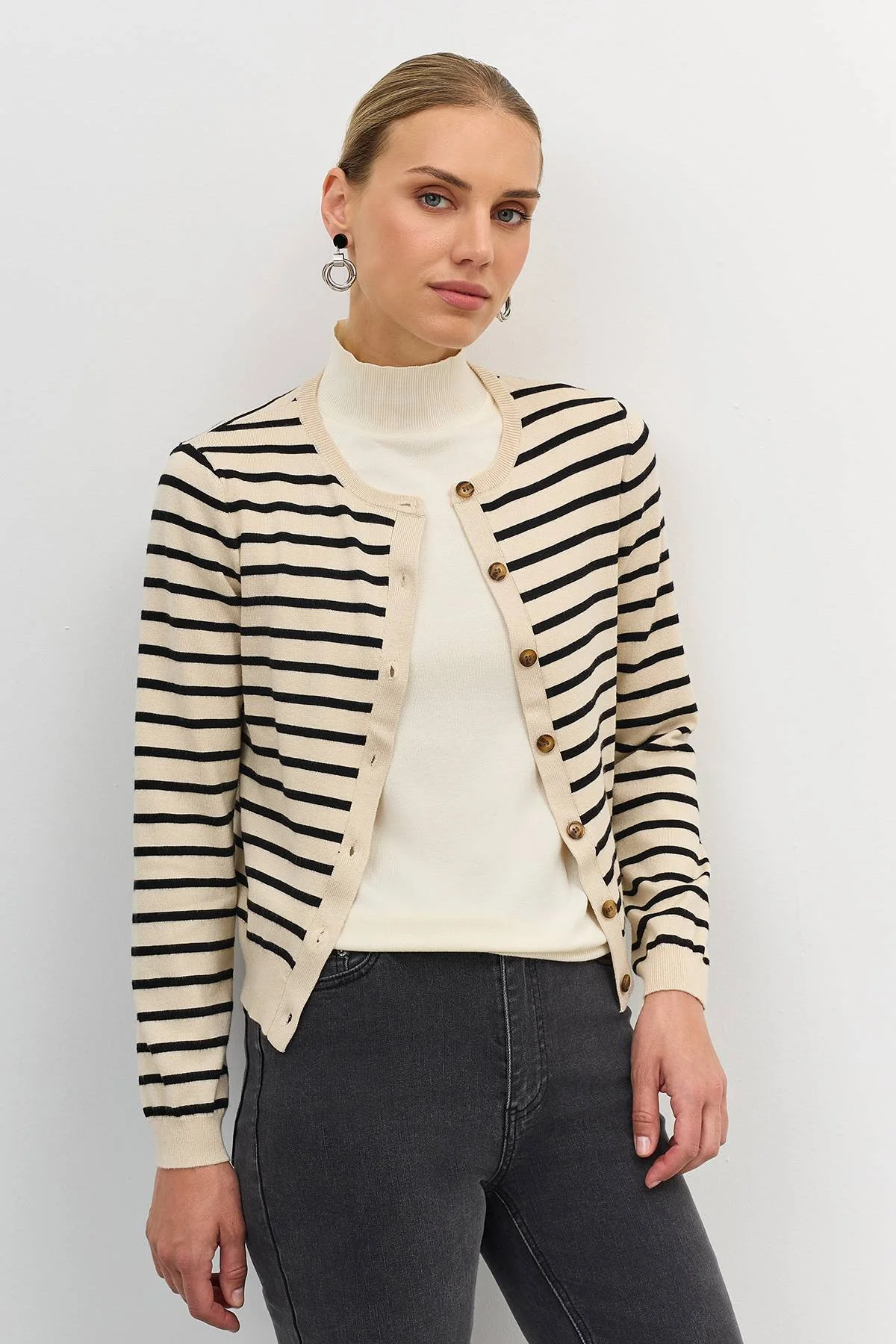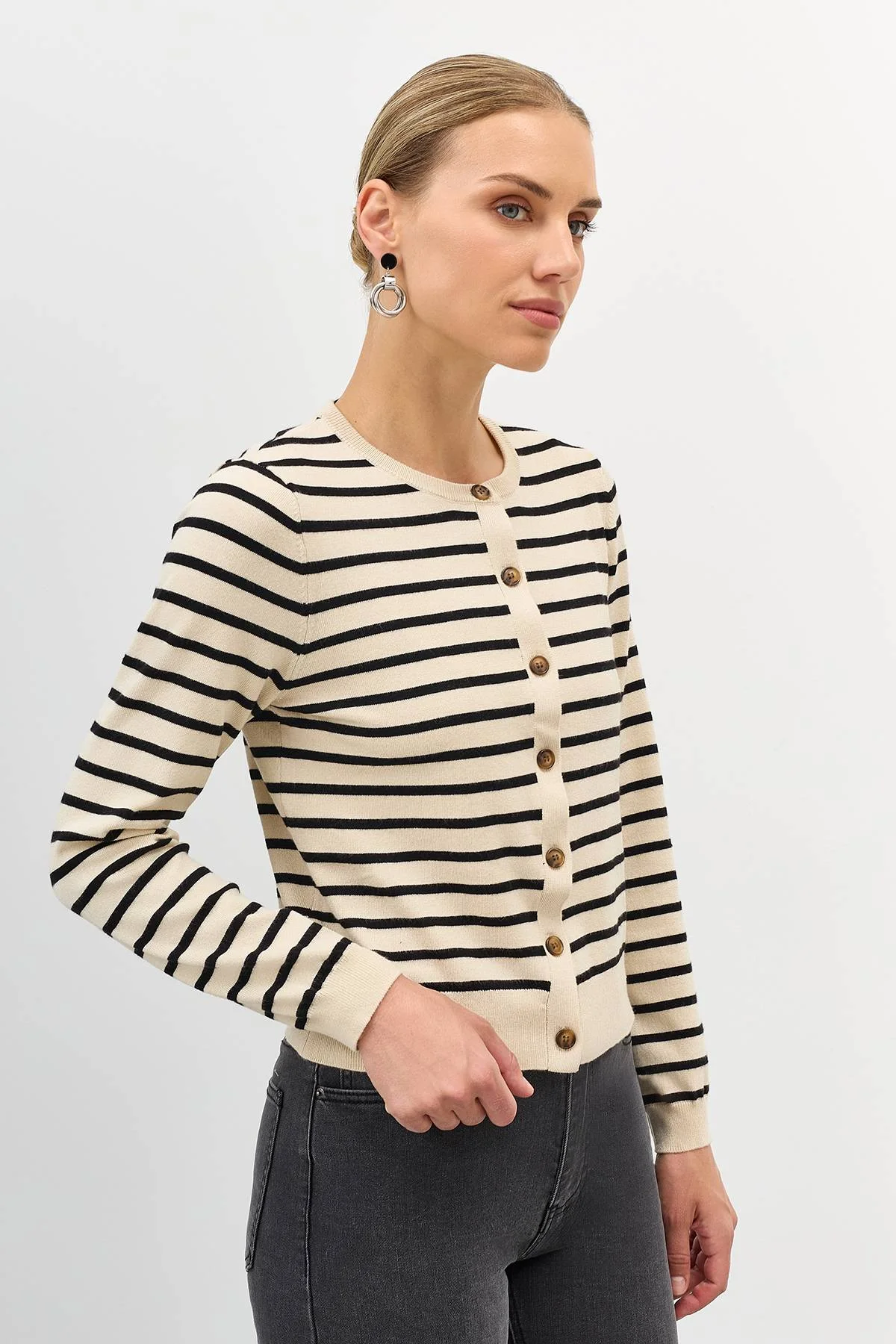 Укороченный вязаный кардиган в тонкую контрастную полоску. Круглый вырез. Свободный силуэт. Застежка на контрастные пуговицы. В составе вискоза и нейлон.