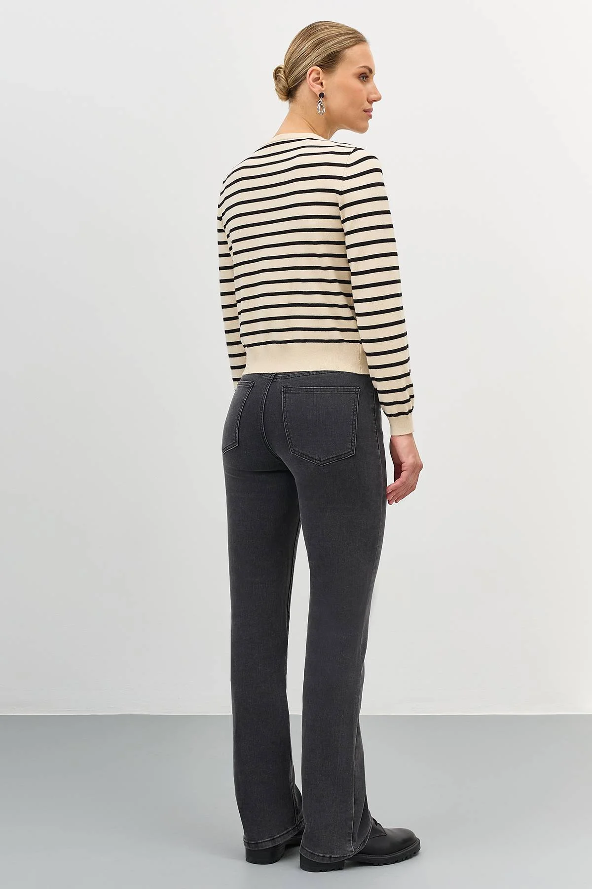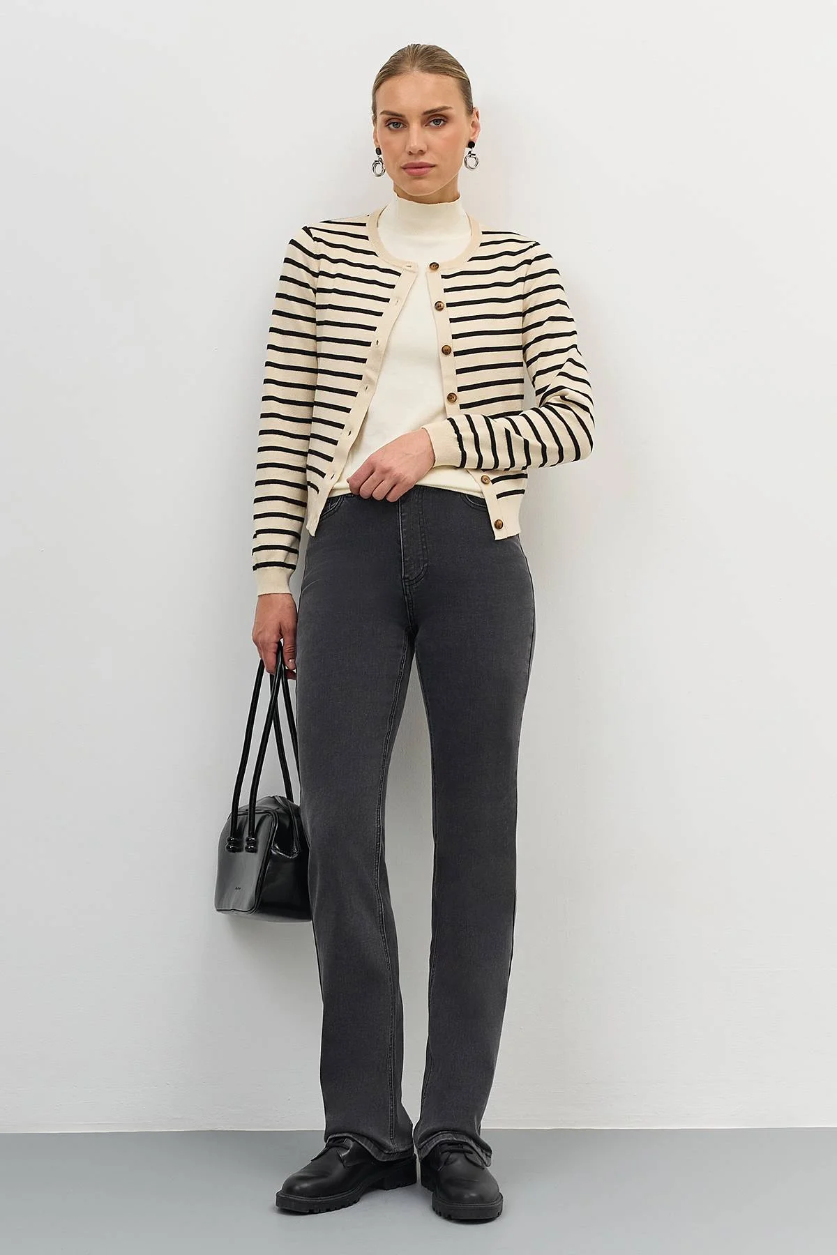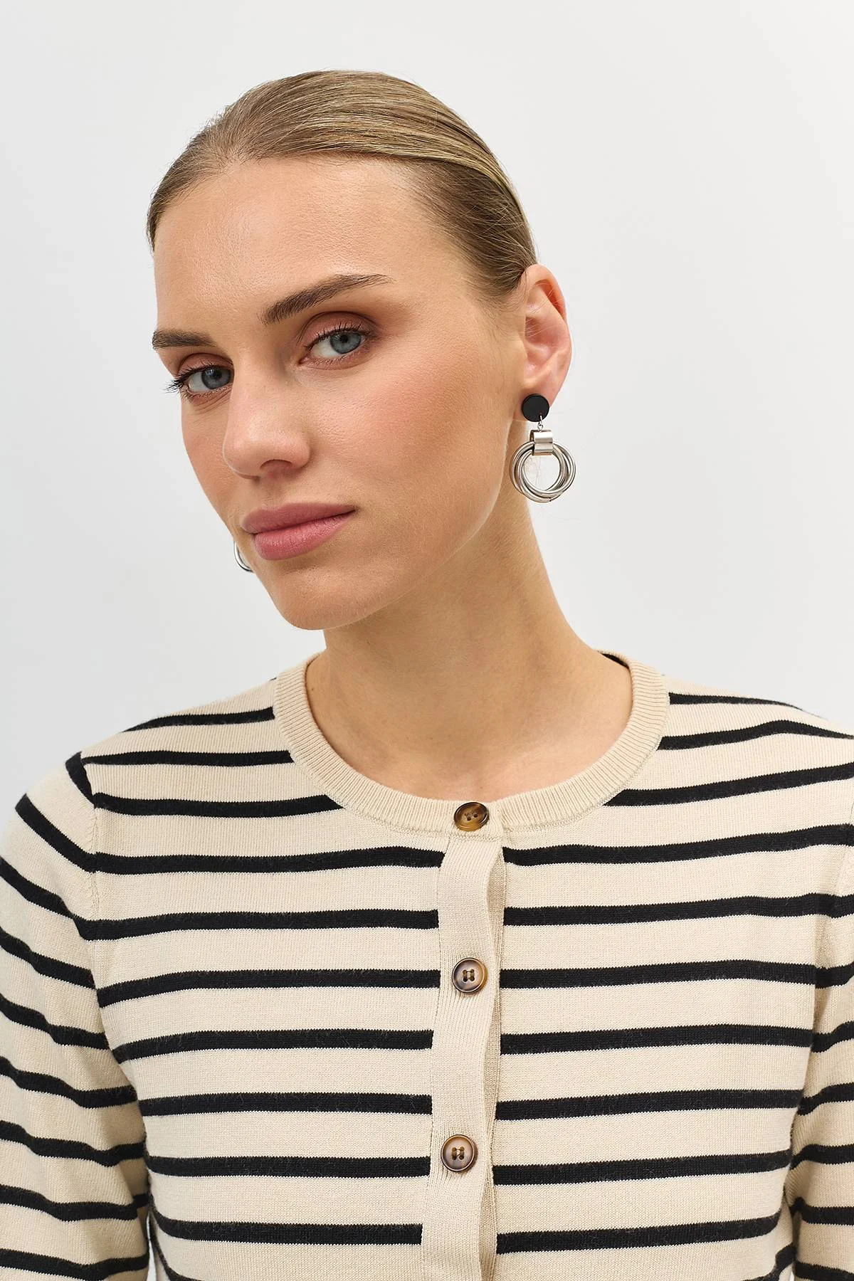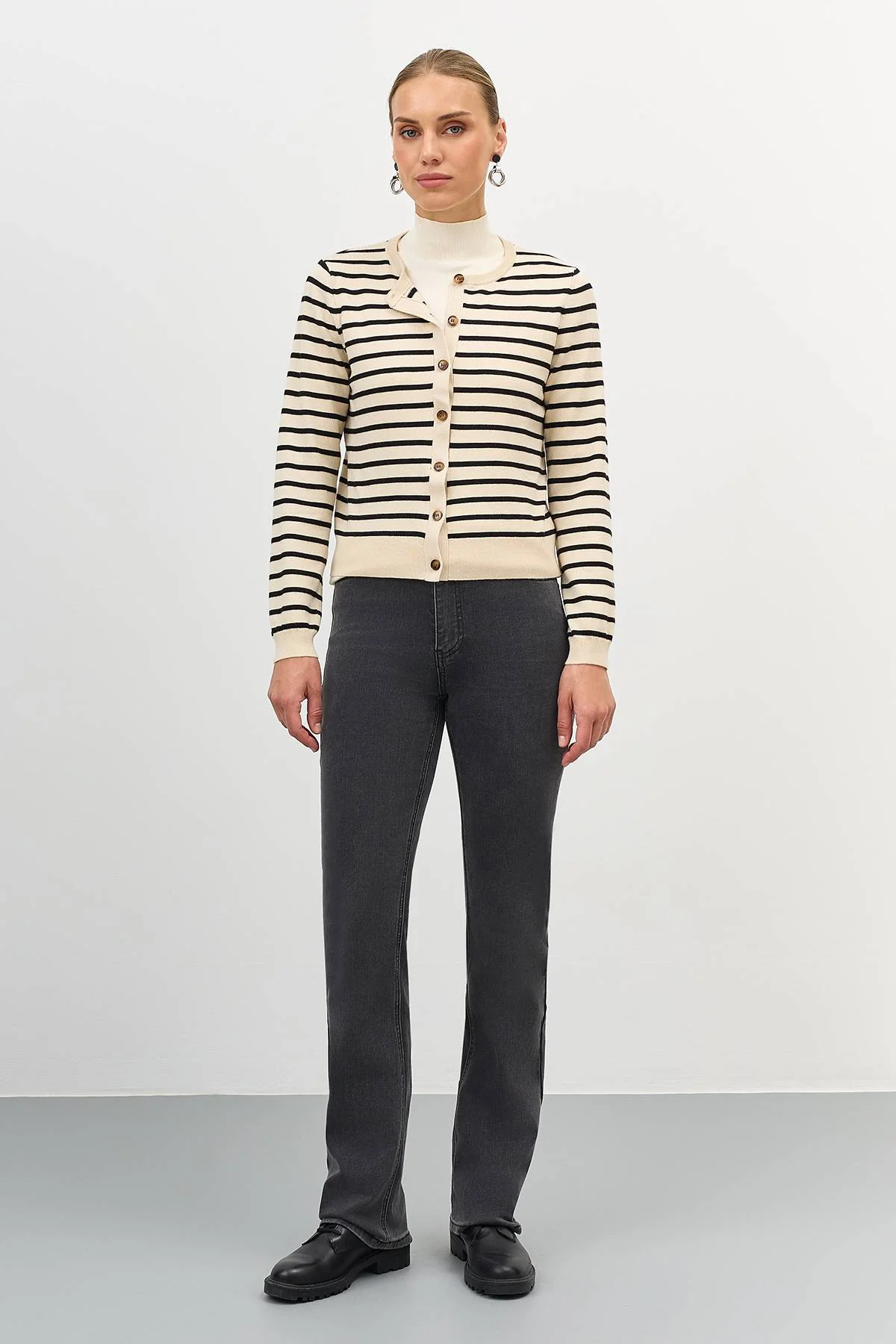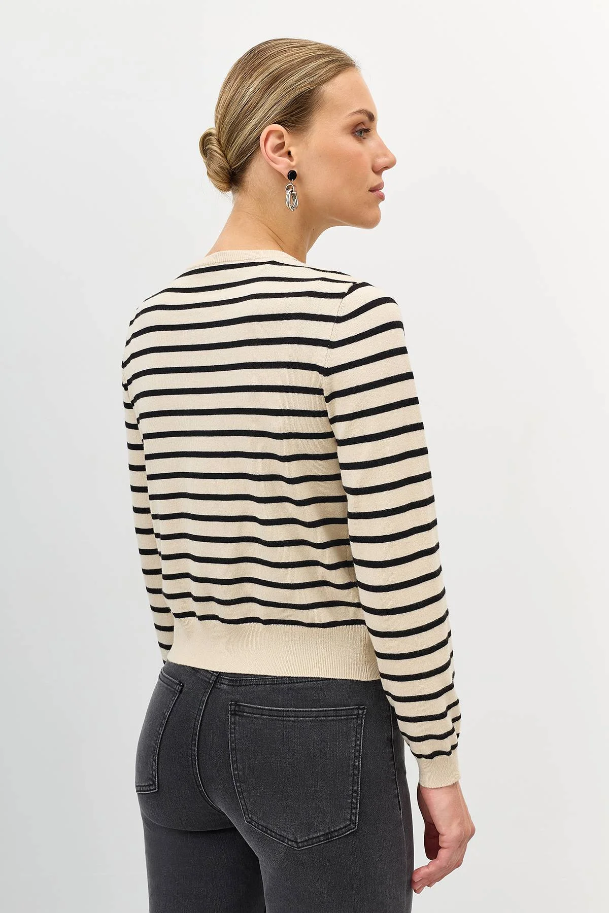 Укороченный вязаный кардиган в тонкую контрастную полоску. Круглый вырез. Свободный силуэт. Застежка на контрастные пуговицы. В составе вискоза и нейлон.