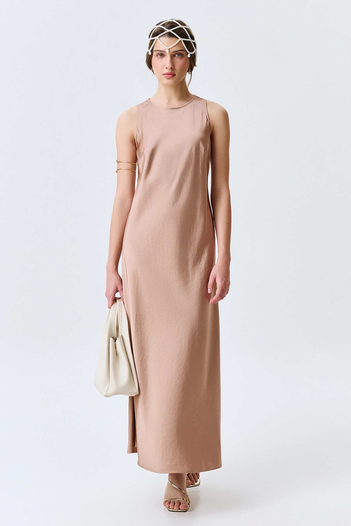 Бежевое сатиновое платье из смесовой вискозы, 50 Бежевое сатиновое платье из смесовой вискозы