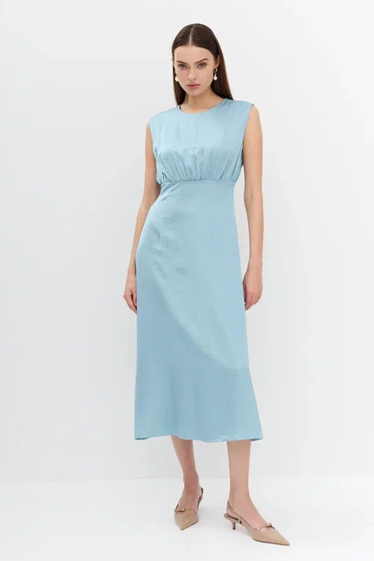 Элегантное платье со сборкой по талии в голубом цвете, 44р