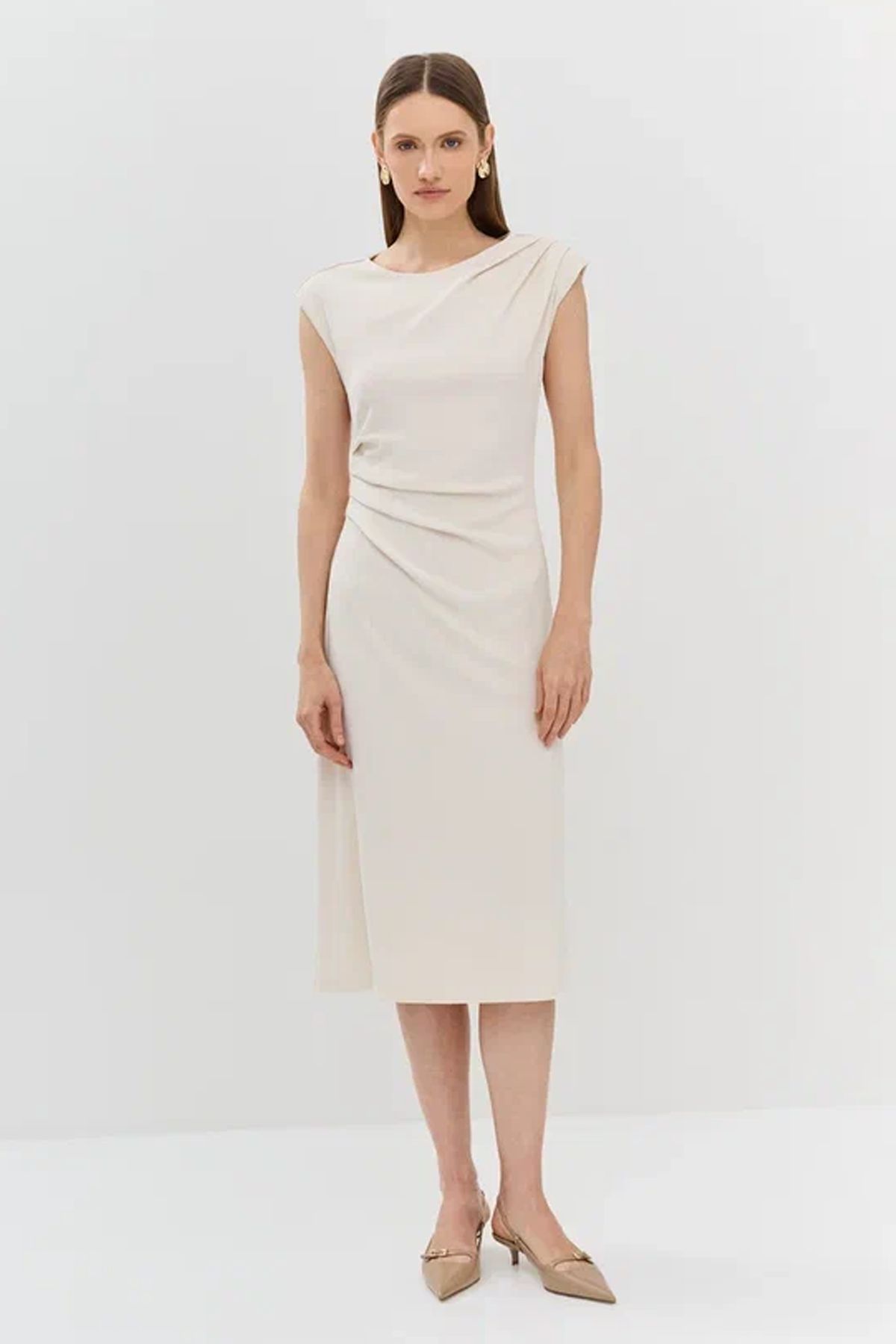 Классическое платье в светло-бежевом цвете с коротким рукавом, 48р