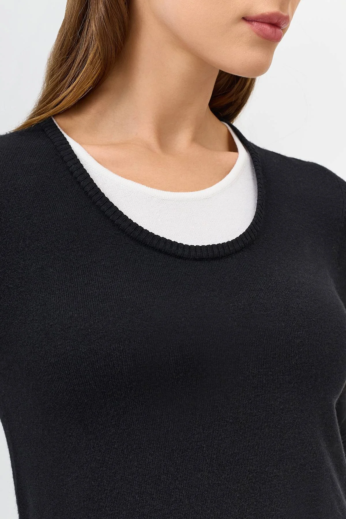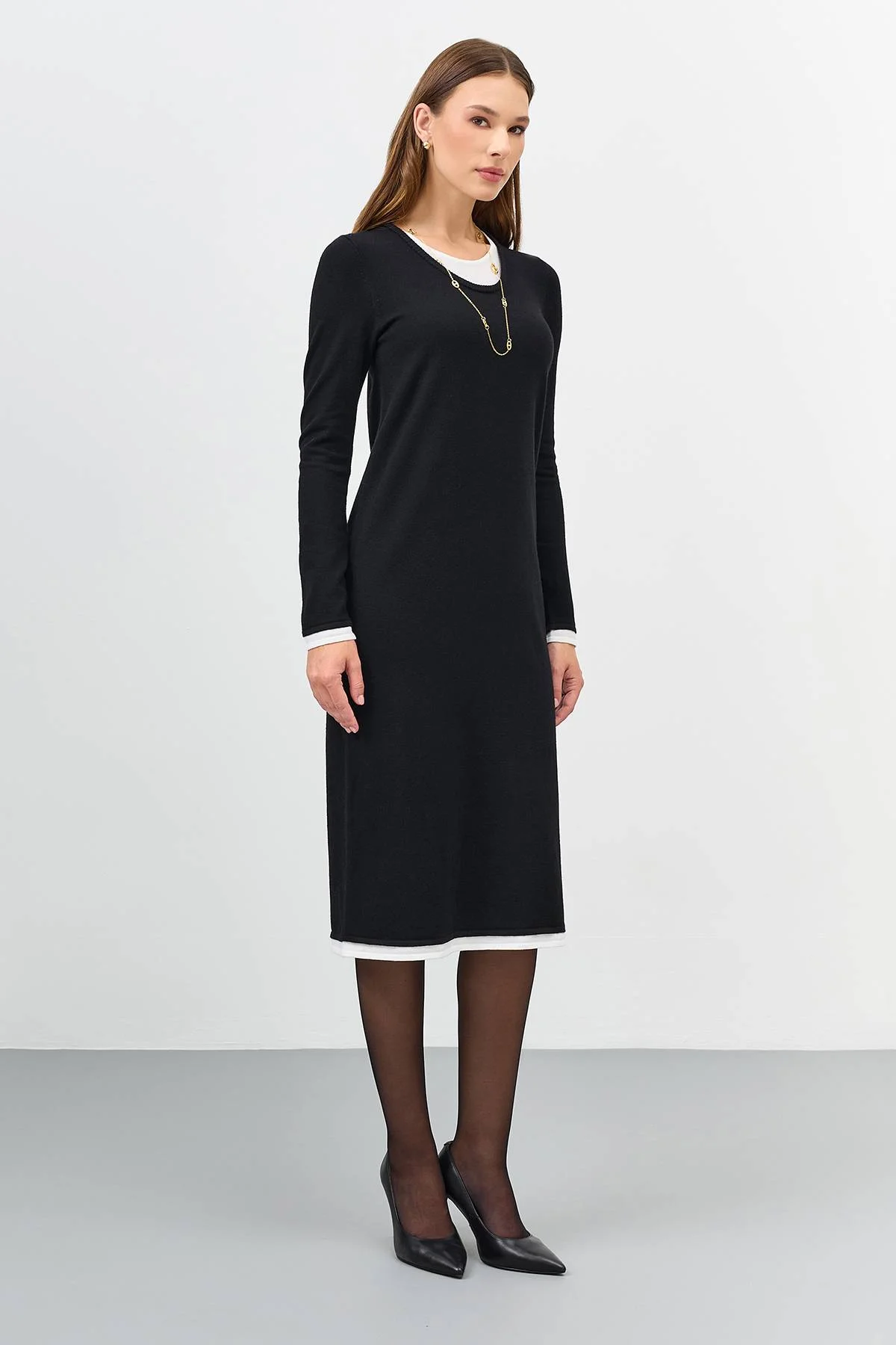 Вязаное платье-миди с контрастными деталями по горловине и рукавам. Прямой силуэт. Круглый вырез. В составе шерсть.