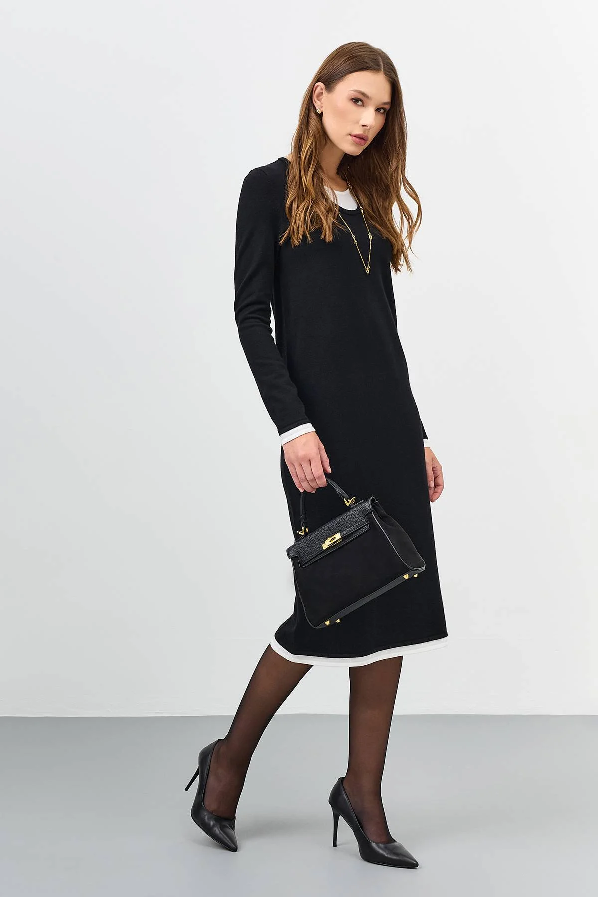 Вязаное платье-миди с контрастными деталями по горловине и рукавам. Прямой силуэт. Круглый вырез. В составе шерсть.