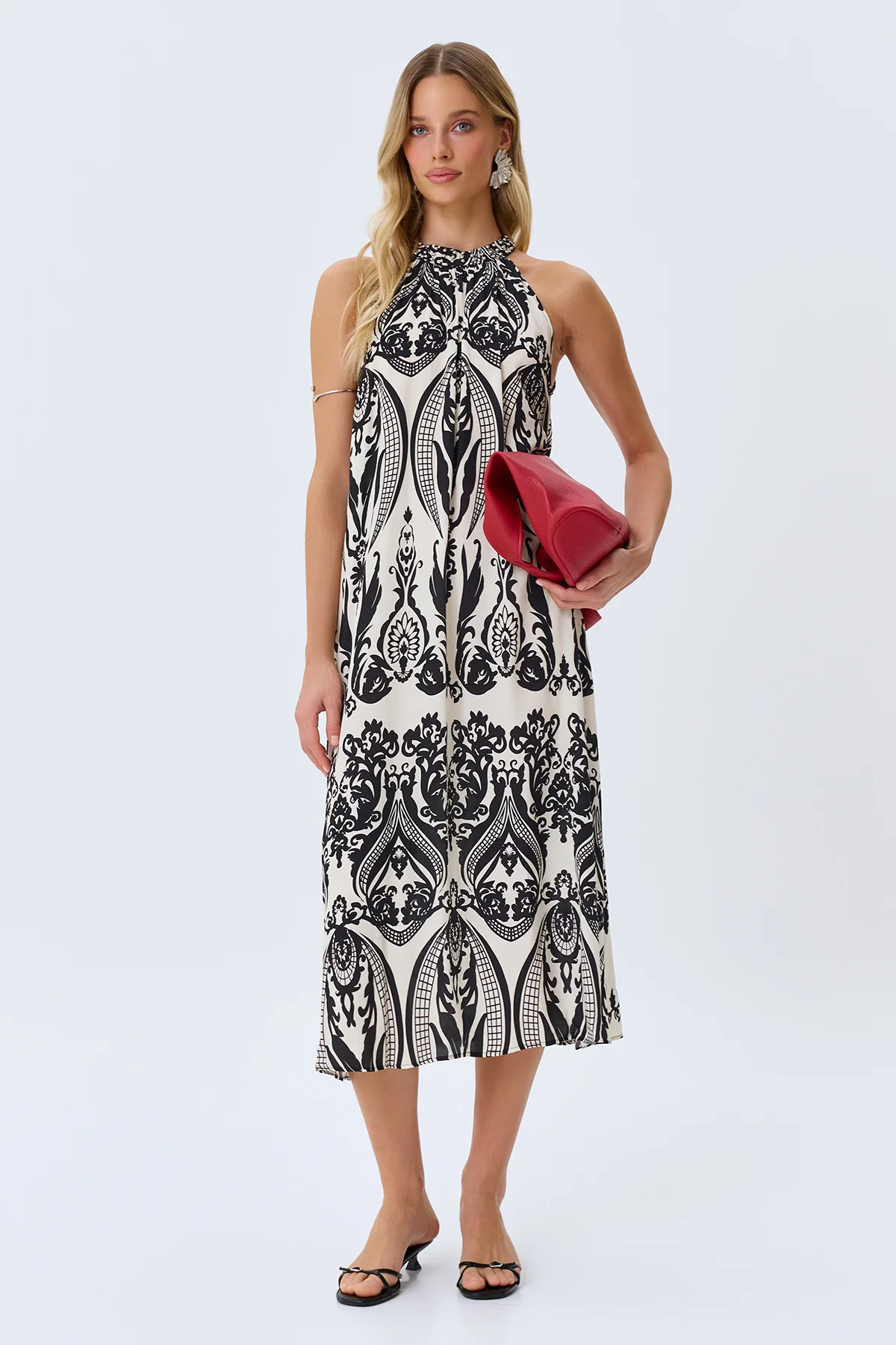 Монохромный этнический принт придает образу неповторимый шарм, а вырез халтер, дополненный металлической фурнитурой, добавляет нотку пикантности. Боковые карманы в швах – удобное решение для хранения мелочей.