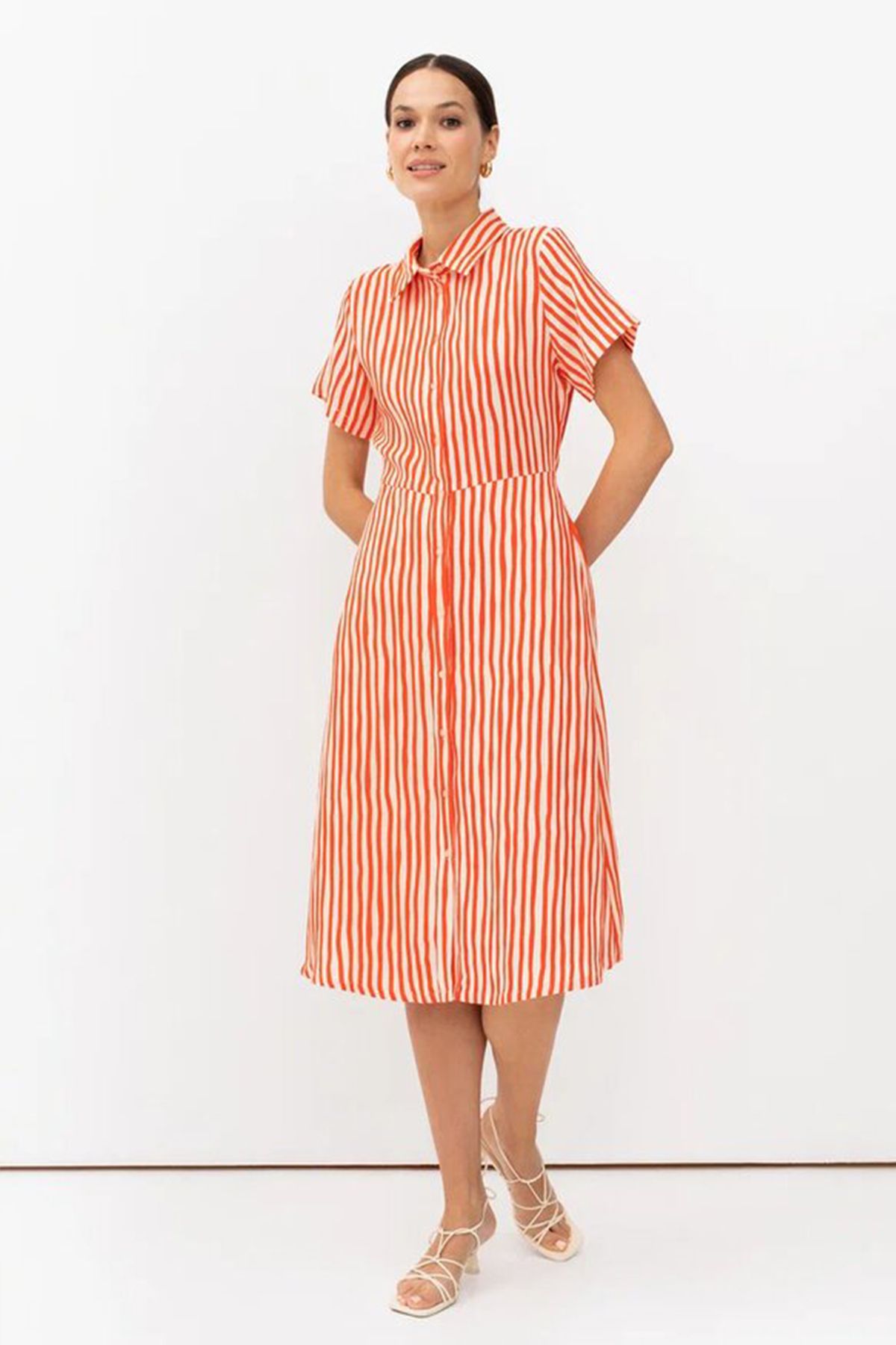 Платье-рубашка в яркую вертикальную полоску, капсула Summer City. Идеальный выбор для создания легкого и непринужденного летнего образа. Материал изделия: приятная к телу вискоза с добавлением нейлона, обеспечивающего износостойкость и долговечность. Отложной воротник придает модели классический вид. Приталенный силуэт подчеркивает достоинства фигуры. Застежка на пуговицы по всей длине позволяет регулировать глубину выреза. Разрез на спинке по талии дополнен эластичными резинками, обеспечивающими комфортную посадку и свободу движений.