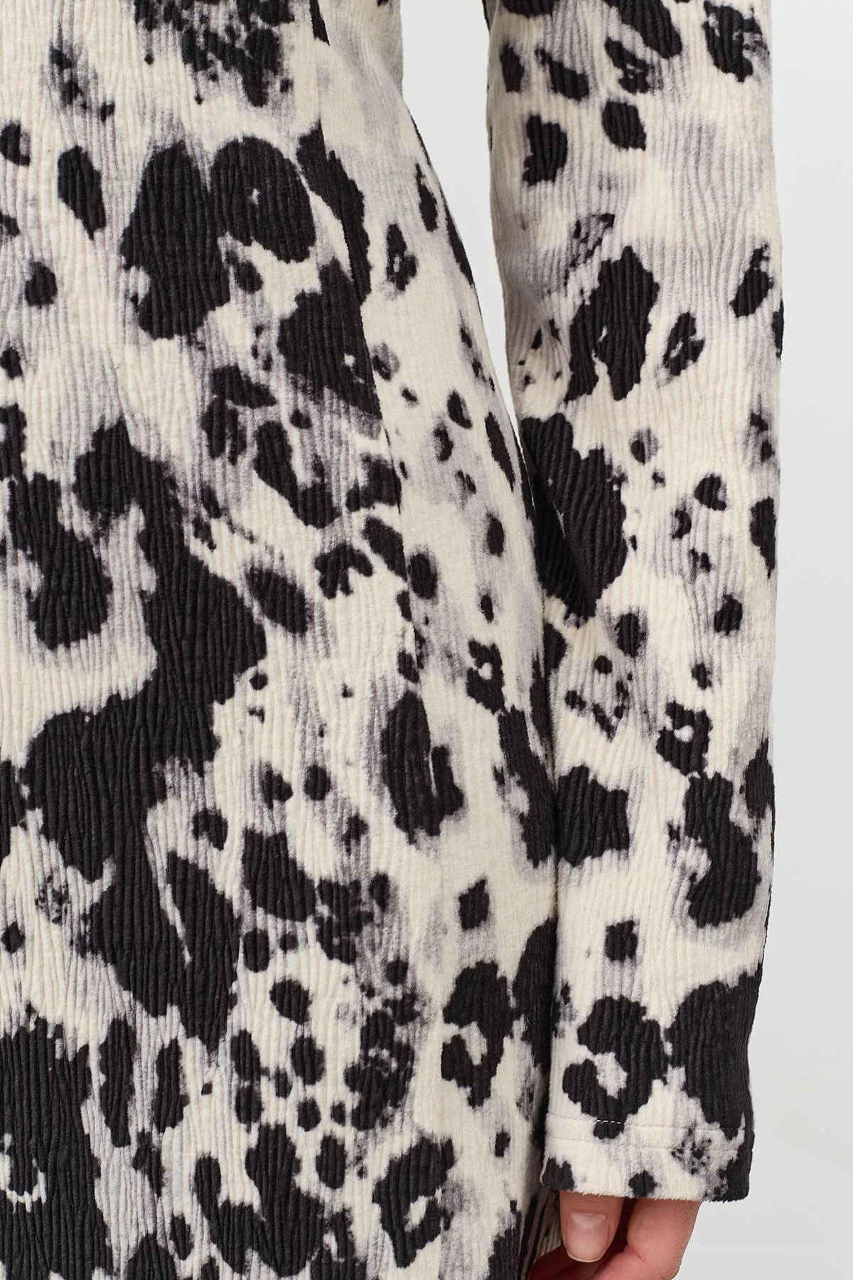 Платье из фактурного трикотажа с монохромным принтом. Приталенный силуэт, расклешенный к низу. Круглый вырез. Длинные рукава. Застежка на молнию.