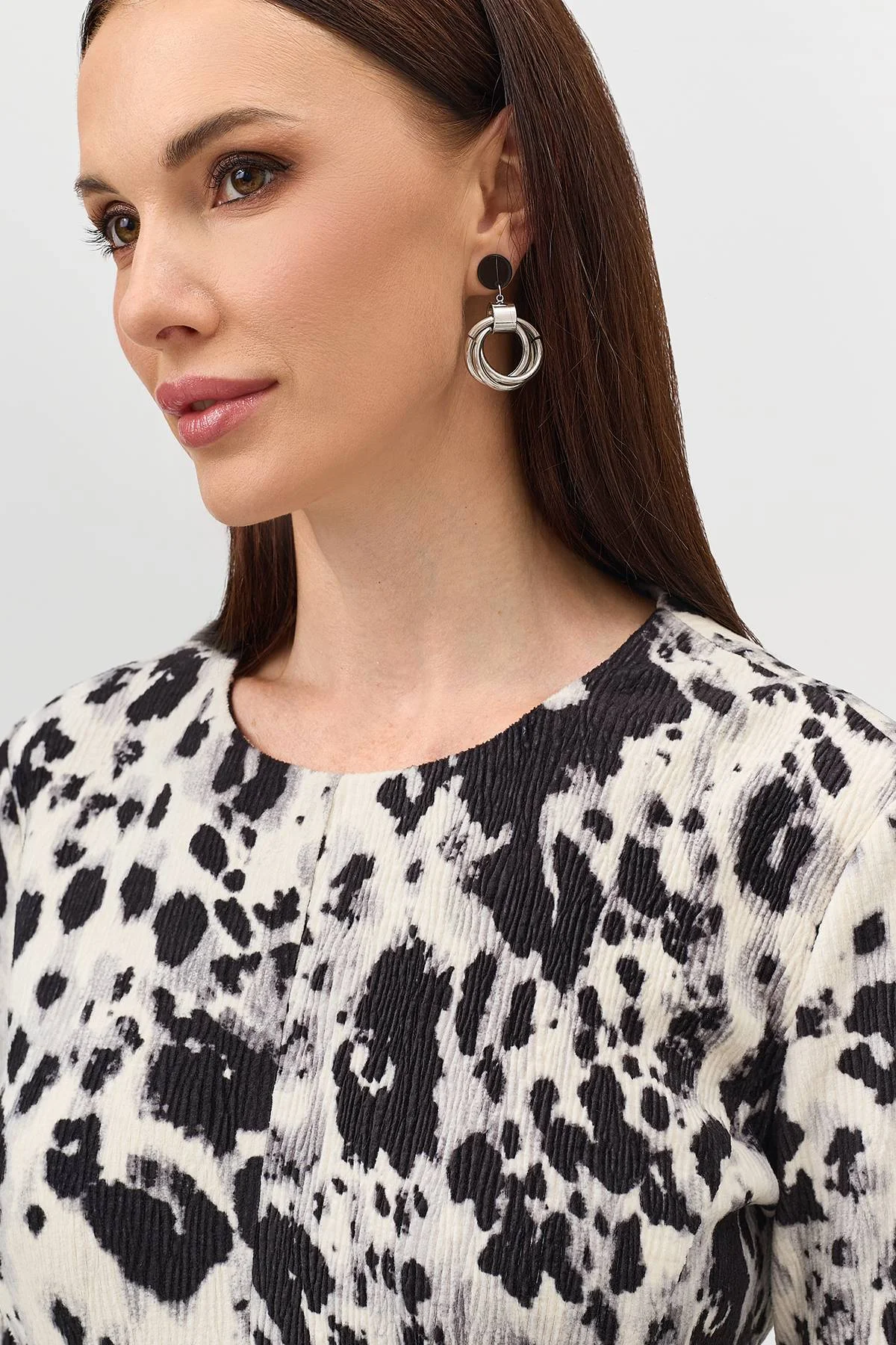 Платье из фактурного трикотажа с монохромным принтом. Приталенный силуэт, расклешенный к низу. Круглый вырез. Длинные рукава. Застежка на молнию.