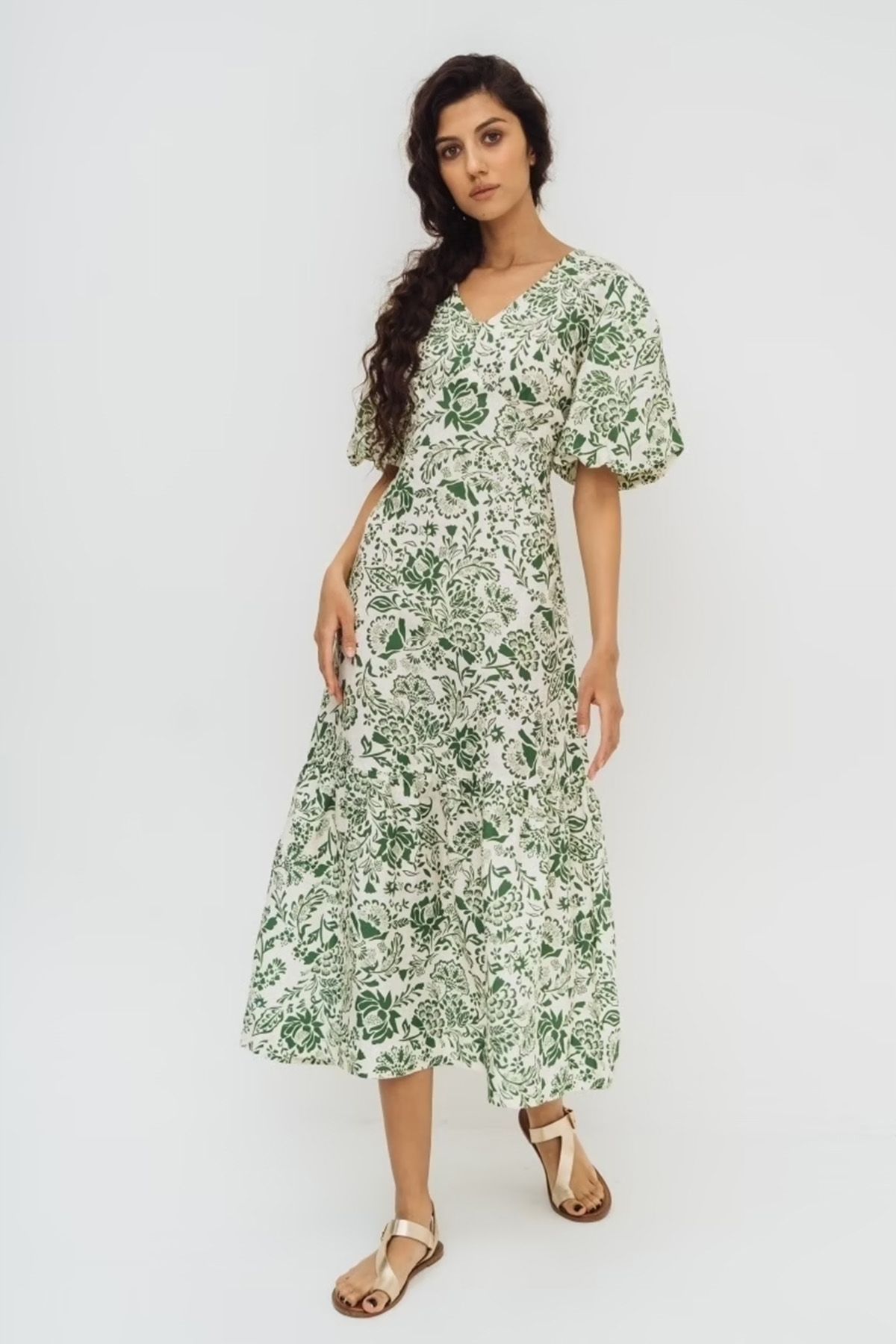 Платье с зелёным принтом и объёмными рукавами, 44р