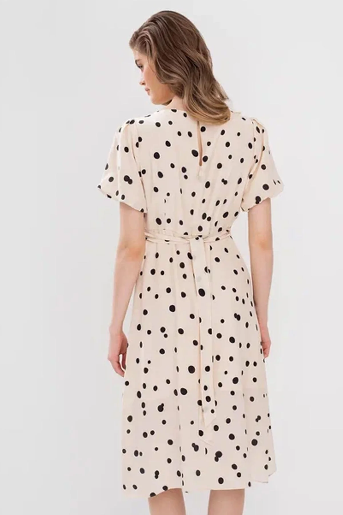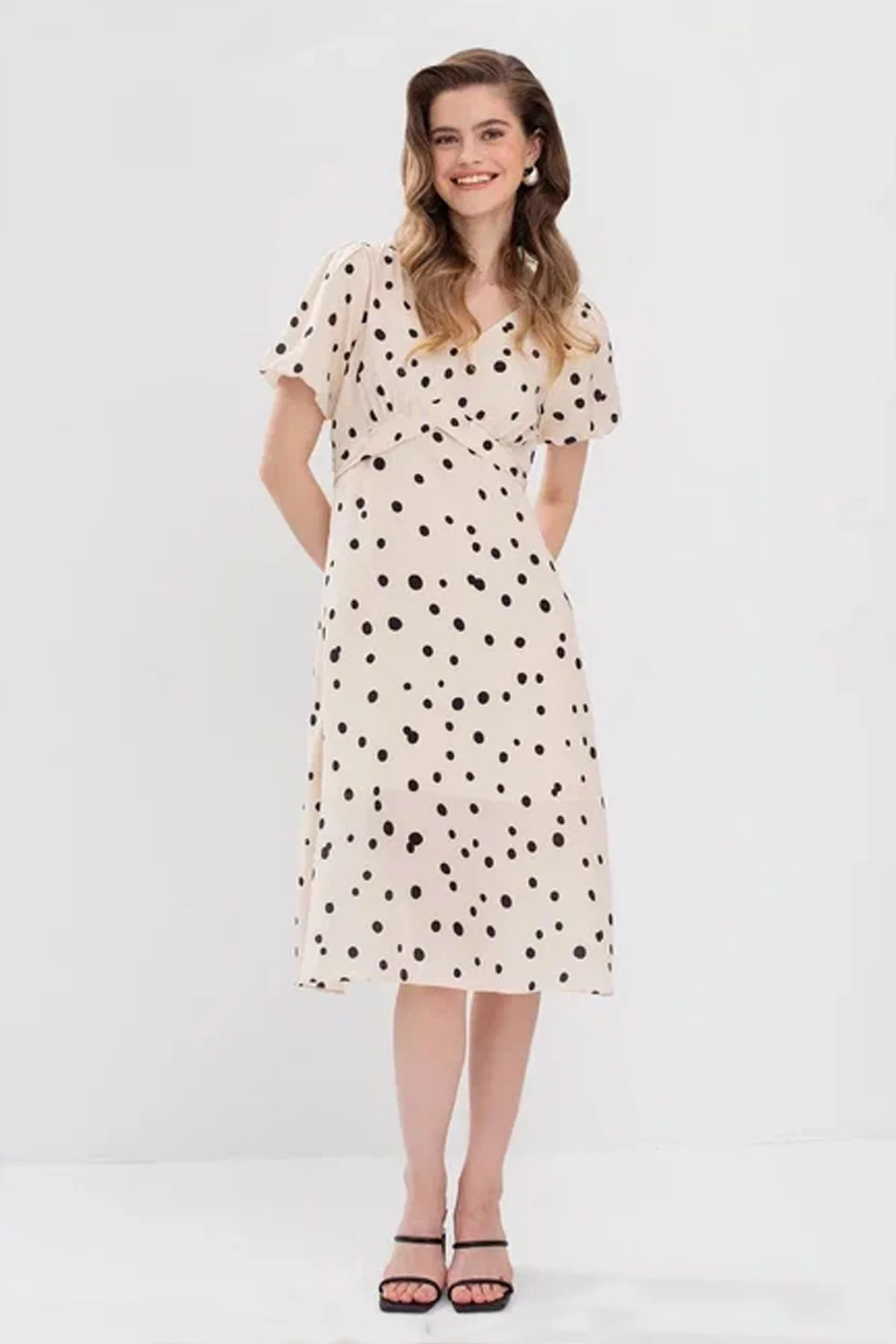 Платье с объемными короткими рукавами. Модель из капсулы Daily Mail выполнена из полиэстера, обеспечивающего легкость и комфорт в носке. Рукава дополнены резинкой, создающей эффект присборенности и фиксирующей их положение. V-образный вырез горловины подчеркивает линию шеи. Отрезная линия под грудью со сборкой формирует женственный силуэт и добавляет платью изящности. Для дополнительного комфорта и непрозрачности предусмотрена подкладка.