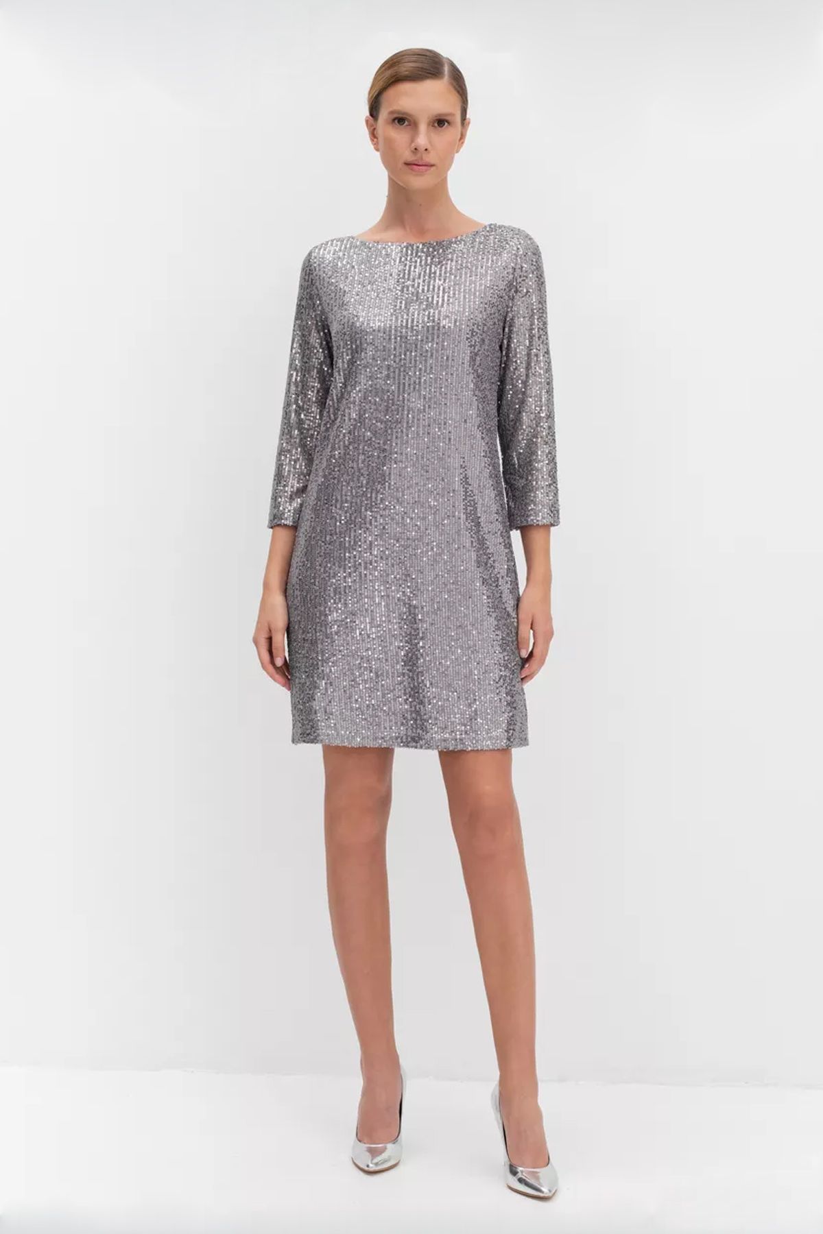 Платье с серебристыми пайетками из капсулы Disco Art Party. Изделие выполнено из полиэстера с добавлением спандекса, что обеспечивает комфортную посадку и эластичность. Длина платья – до середины бедра, что делает его подходящим для вечеринок и танцев. Особенностью модели является V-образный вырез на спинке, добавляющий образу элегантности и соблазнительности.