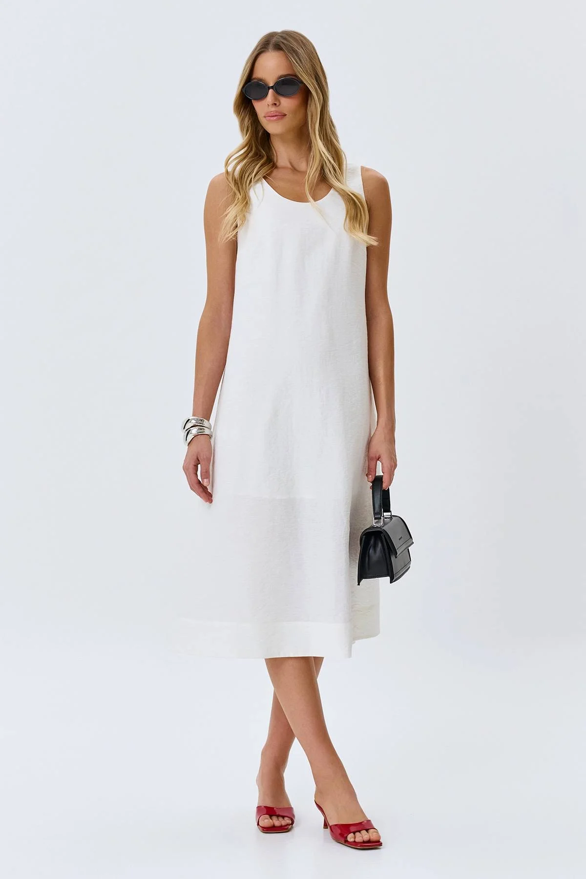 Свободное платье с поясом в белом цвете, 50