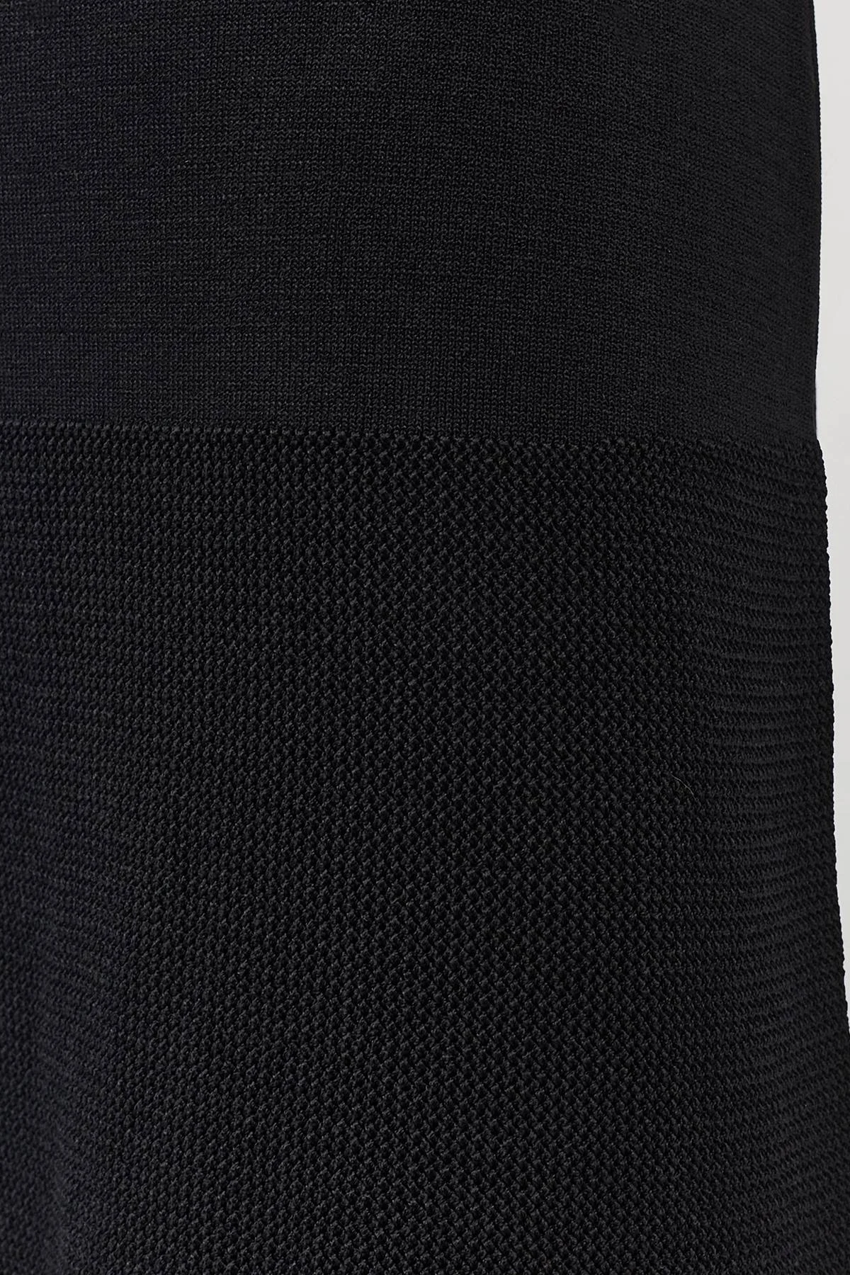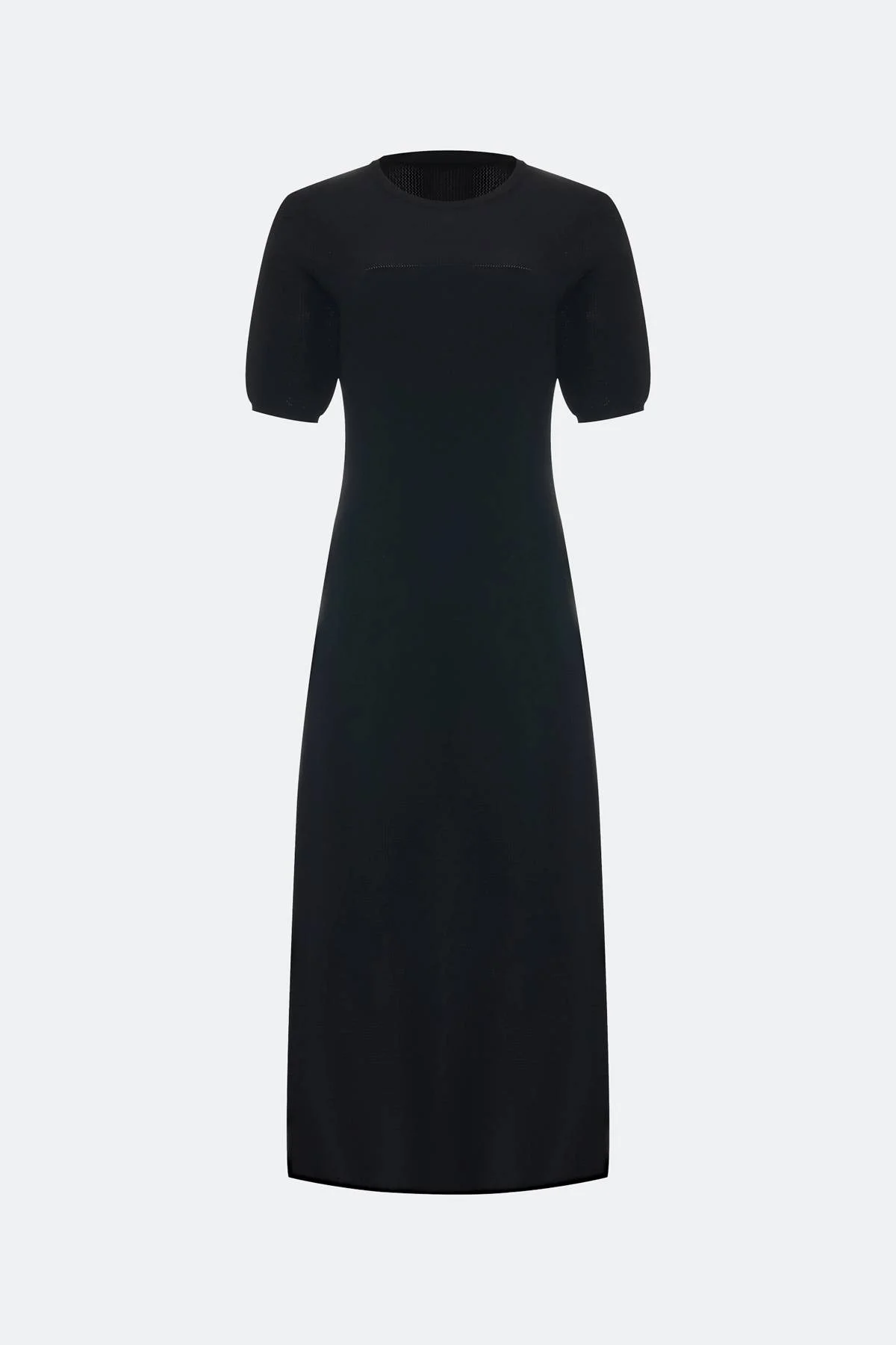 Вязаное платье-миди с полупрозрачными ажурными деталями. Приталенный силуэт. Круглый вырез. Короткие рукава с деликатными манжетами. В составе вискоза.