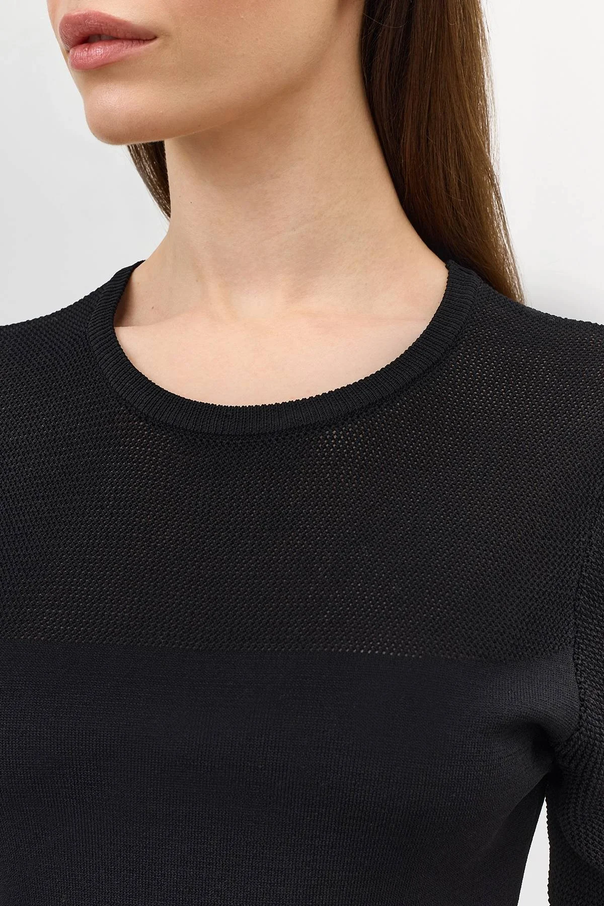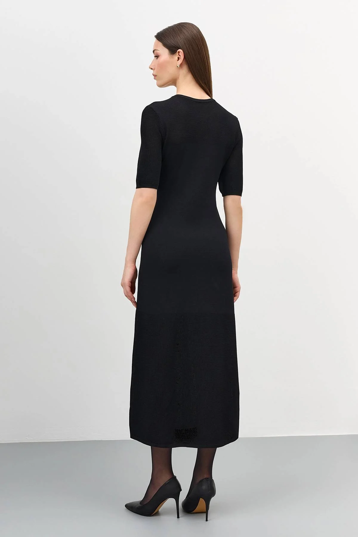 Вязаное платье-миди с полупрозрачными ажурными деталями. Приталенный силуэт. Круглый вырез. Короткие рукава с деликатными манжетами. В составе вискоза.