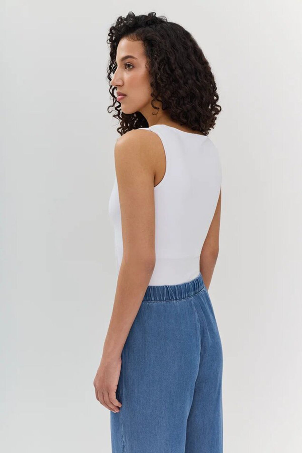 Базовый удлиненный топ в белом цвете с открытой горловиной и без рукавов - это стильный и универсальный элемент гардероба. Удлиненный крой подчеркивает фигуру и легко комбинируется с различными предметами, такими как обтягивающие брюки и юбки. Открытая горловина создает элегантный вид и подчеркивает линию шеи. Такой топ идеально подходит для теплой погоды, обеспечивая комфорт и легкость. Он может стать основой как для повседневных, так и для более формальных образов.