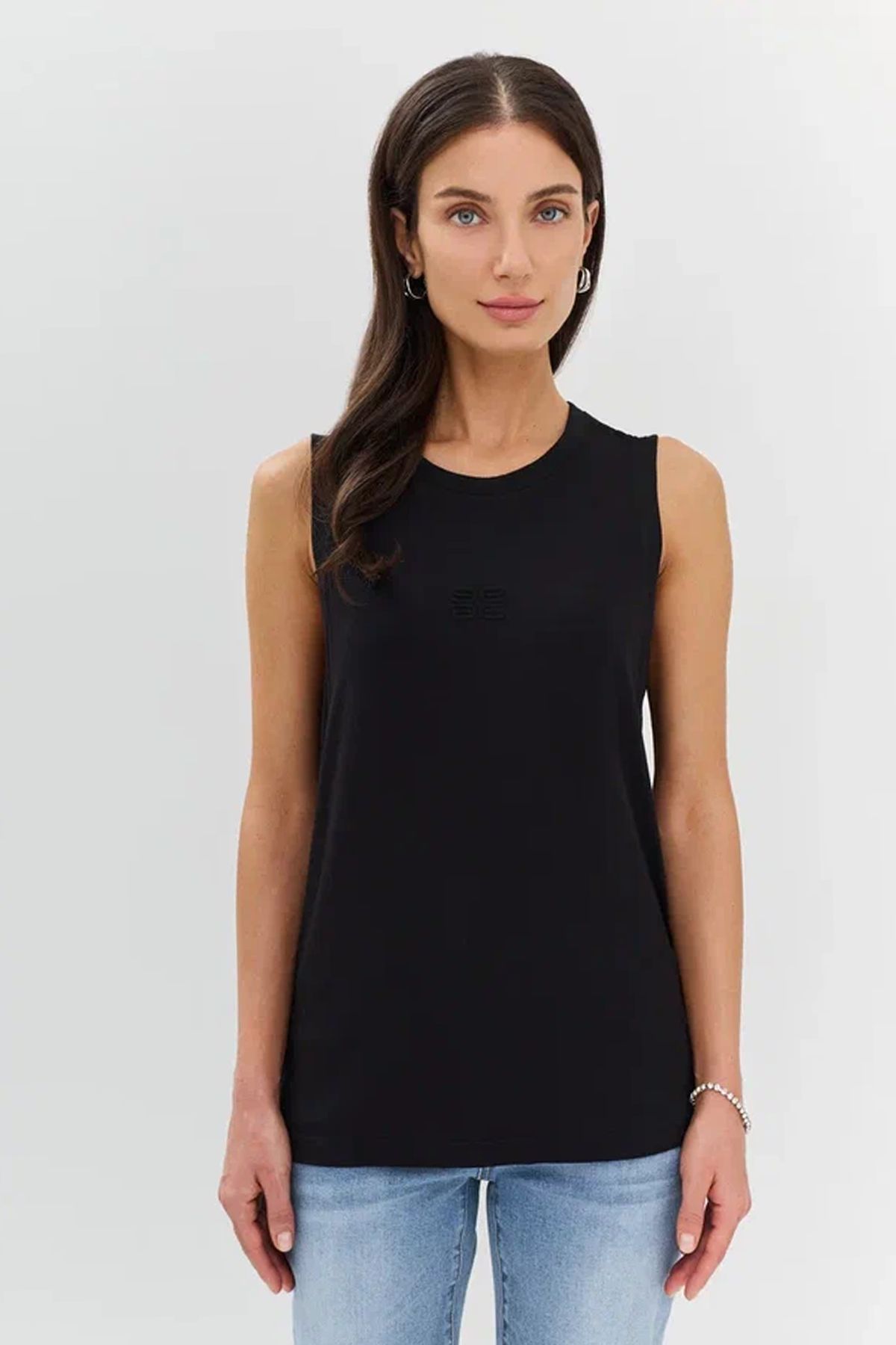 Топ чёрного цвета без рукавов с объёмным брендированным декором, 52р