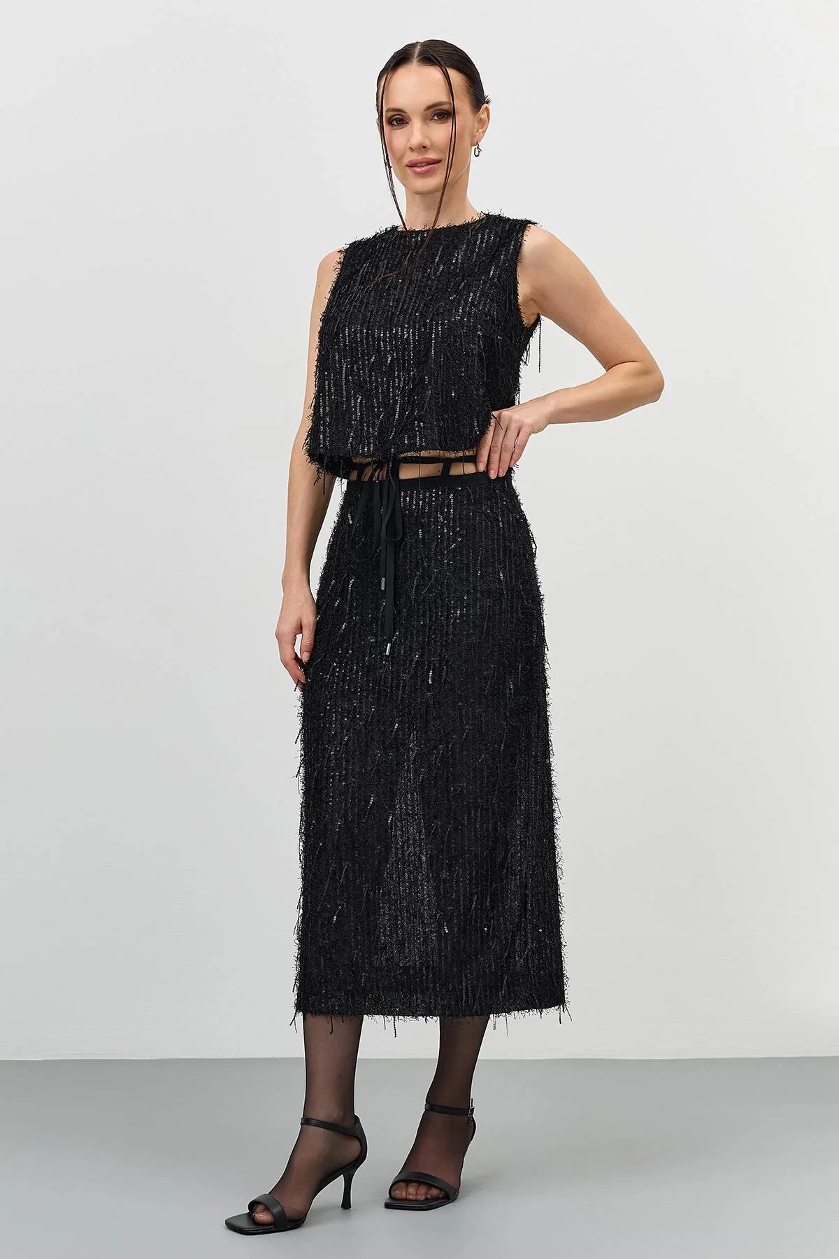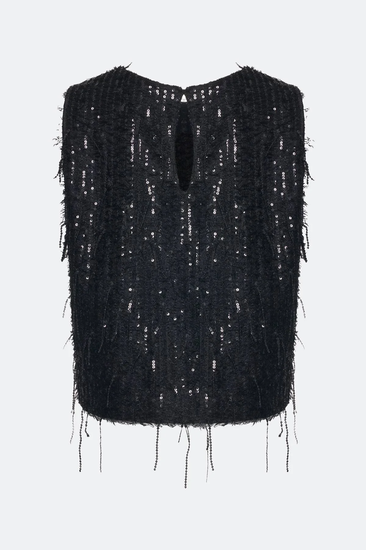 Нарядный топ прямого силуэта из текстурной ткани с пайетками и бахромой. Круглый вырез. Застежка на маленькую пуговицу. Дополнен подкладкой из 100% вискозы.
