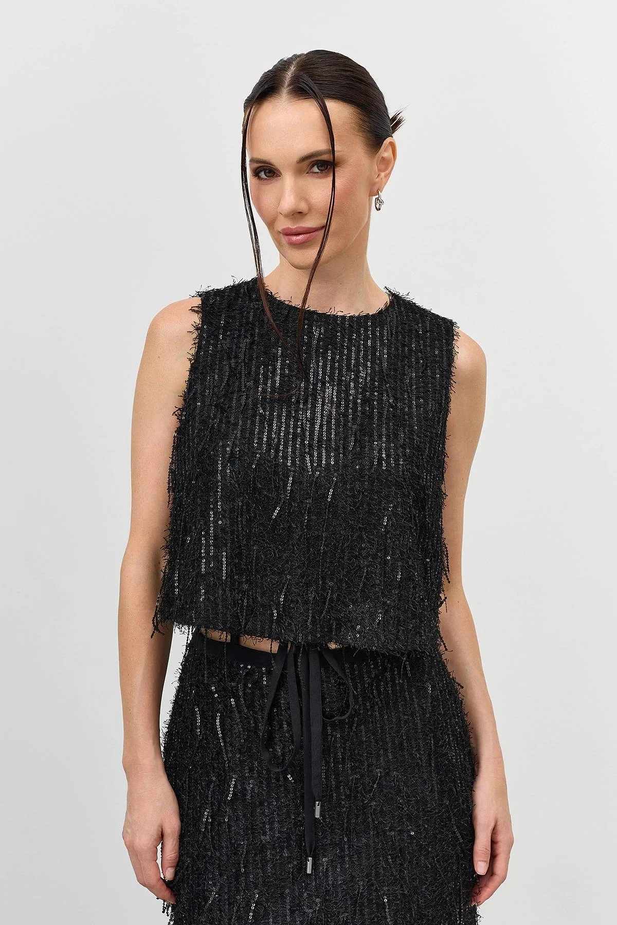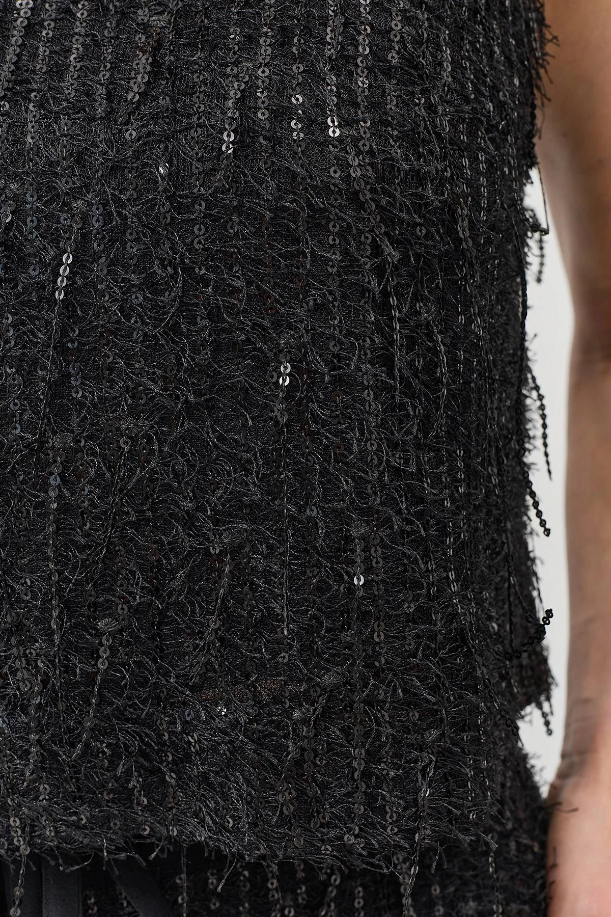 Нарядный топ прямого силуэта из текстурной ткани с пайетками и бахромой. Круглый вырез. Застежка на маленькую пуговицу. Дополнен подкладкой из 100% вискозы.