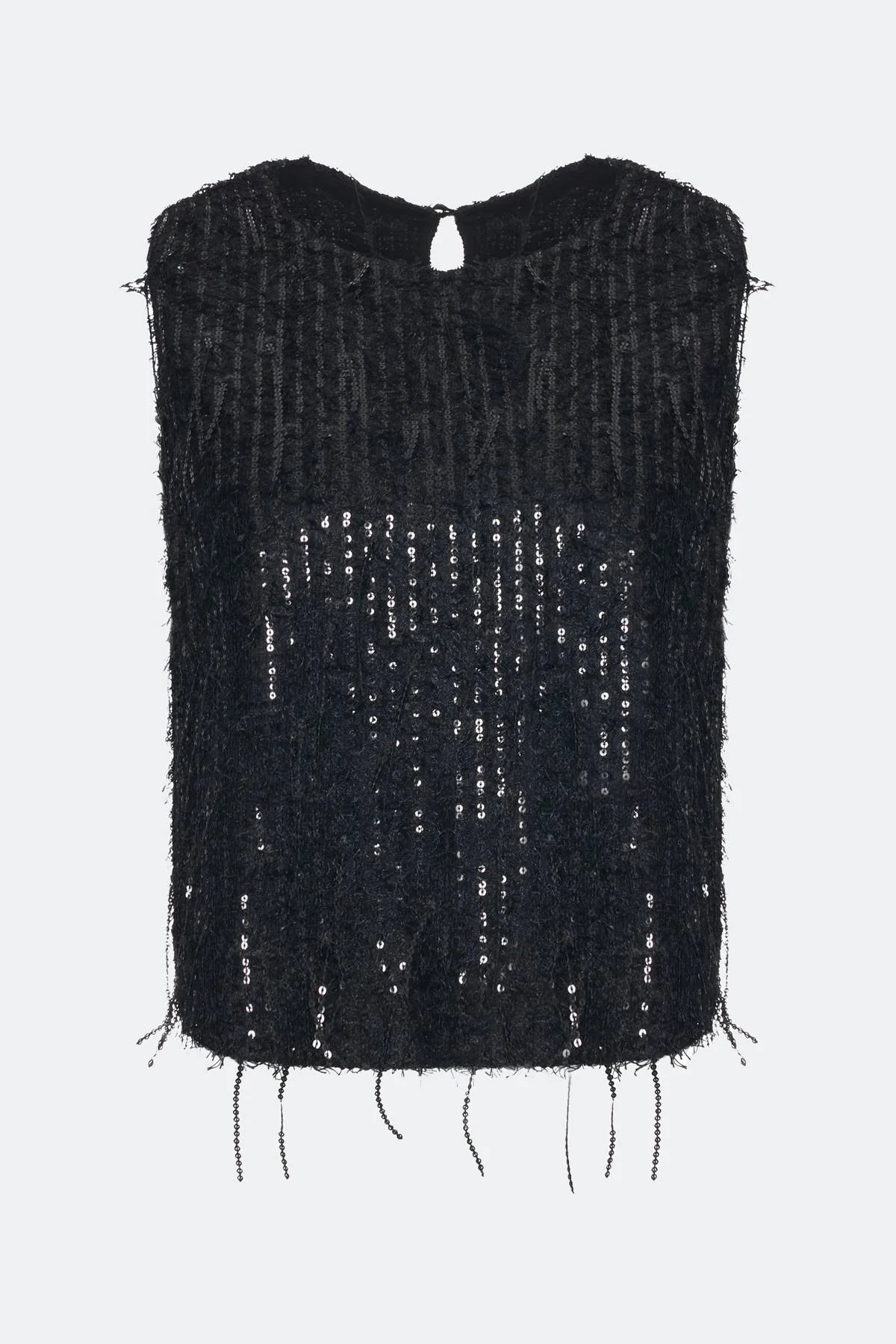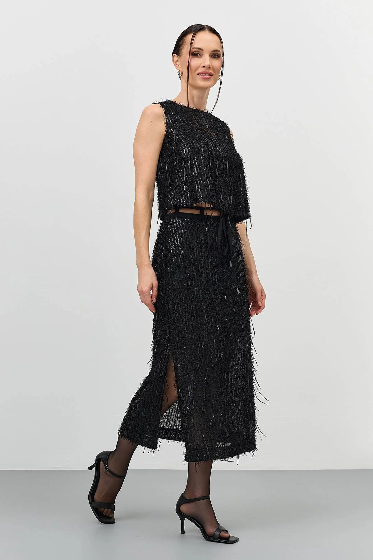 Нарядный топ прямого силуэта из текстурной ткани с пайетками и бахромой. Круглый вырез. Застежка на маленькую пуговицу. Дополнен подкладкой из 100% вискозы.