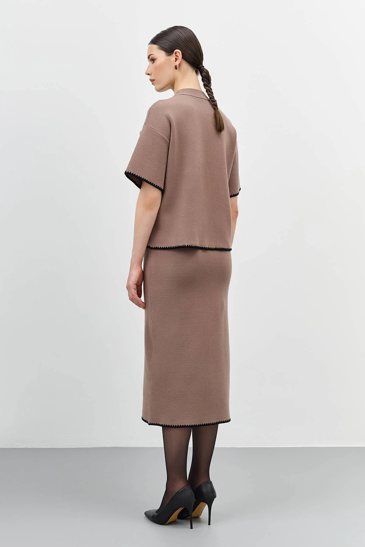 Элегантная трикотажная юбка облегающего кроя на высокой посадкев цвете Мокко. Юбка имеет аккуратную отделку по краю черной нитью, создавая стильный акцент. В комплекте с палантином LBL34-845-05.