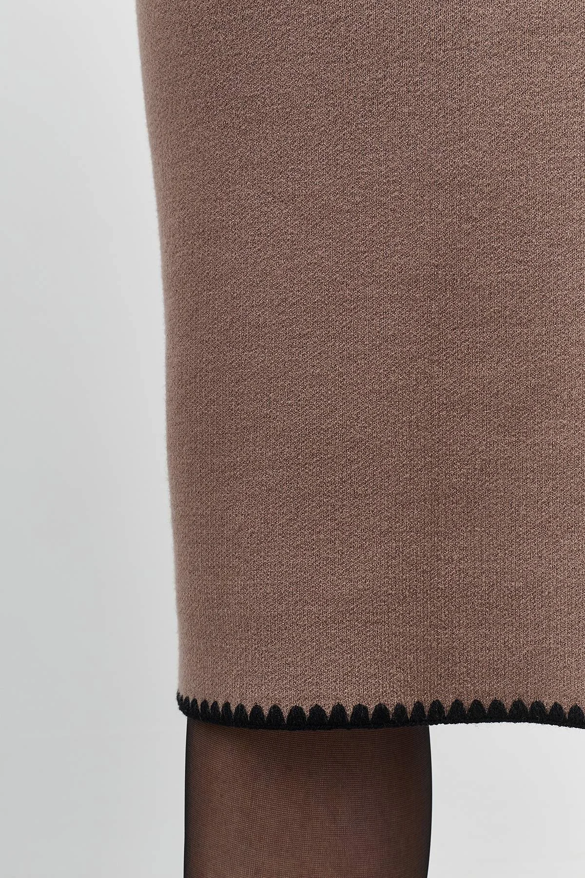 Элегантная трикотажная юбка облегающего кроя на высокой посадкев цвете Мокко. Юбка имеет аккуратную отделку по краю черной нитью, создавая стильный акцент. В комплекте с палантином LBL34-845-05.