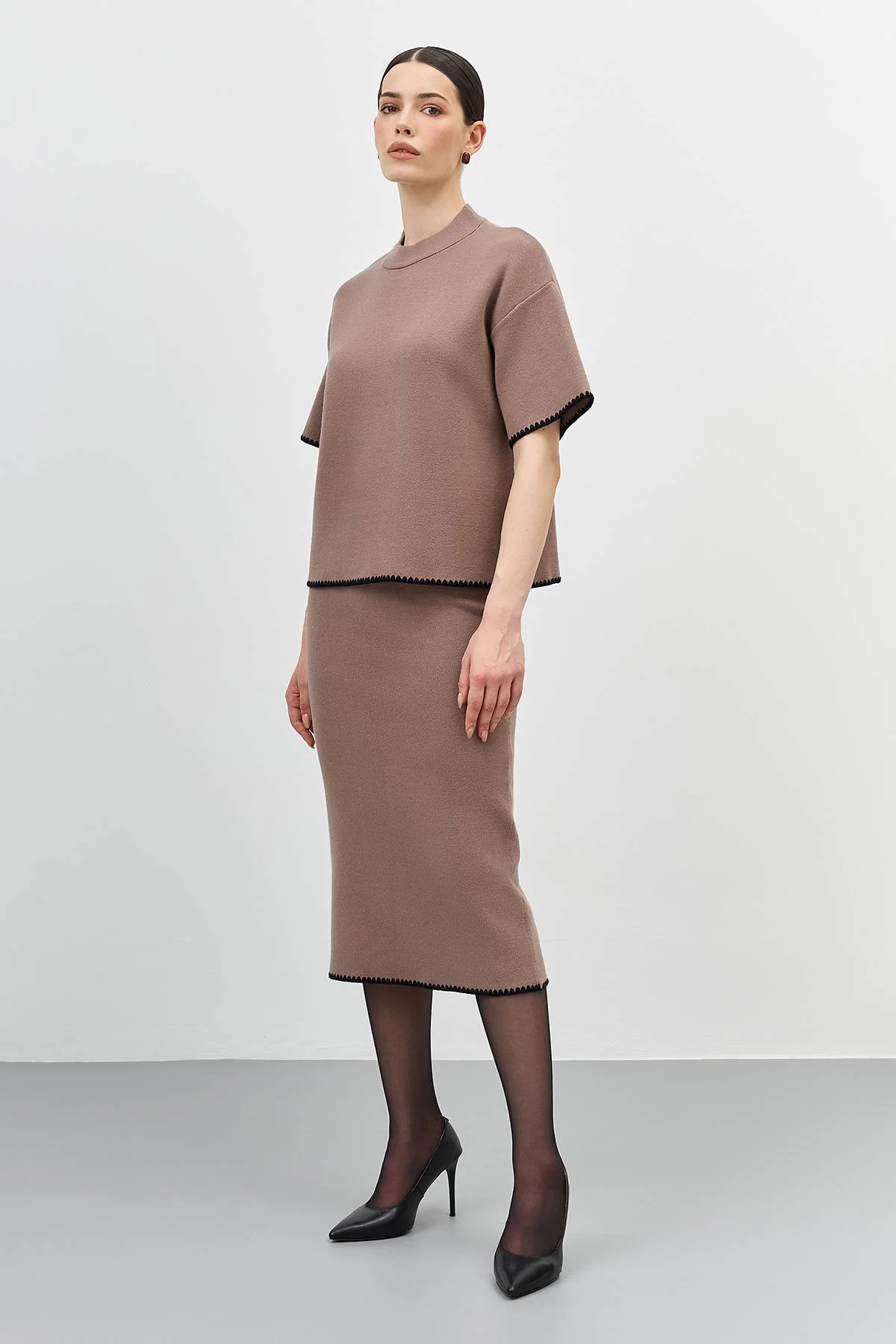 Элегантная трикотажная юбка облегающего кроя на высокой посадкев цвете Мокко. Юбка имеет аккуратную отделку по краю черной нитью, создавая стильный акцент. В комплекте с палантином LBL34-845-05.