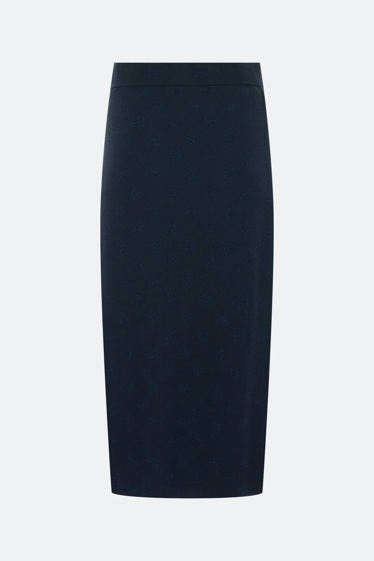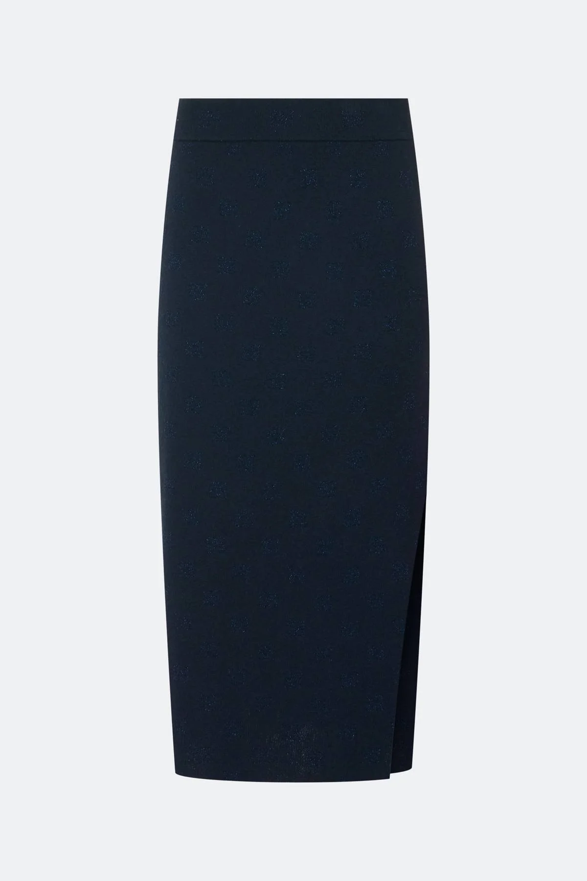 Жакардовая вязаная юбка с блеском. Прямой силуэт. Длина миди. Резинка по линии талии. Высокий разрез в боковом шве. В составе вискоза и шерсть.