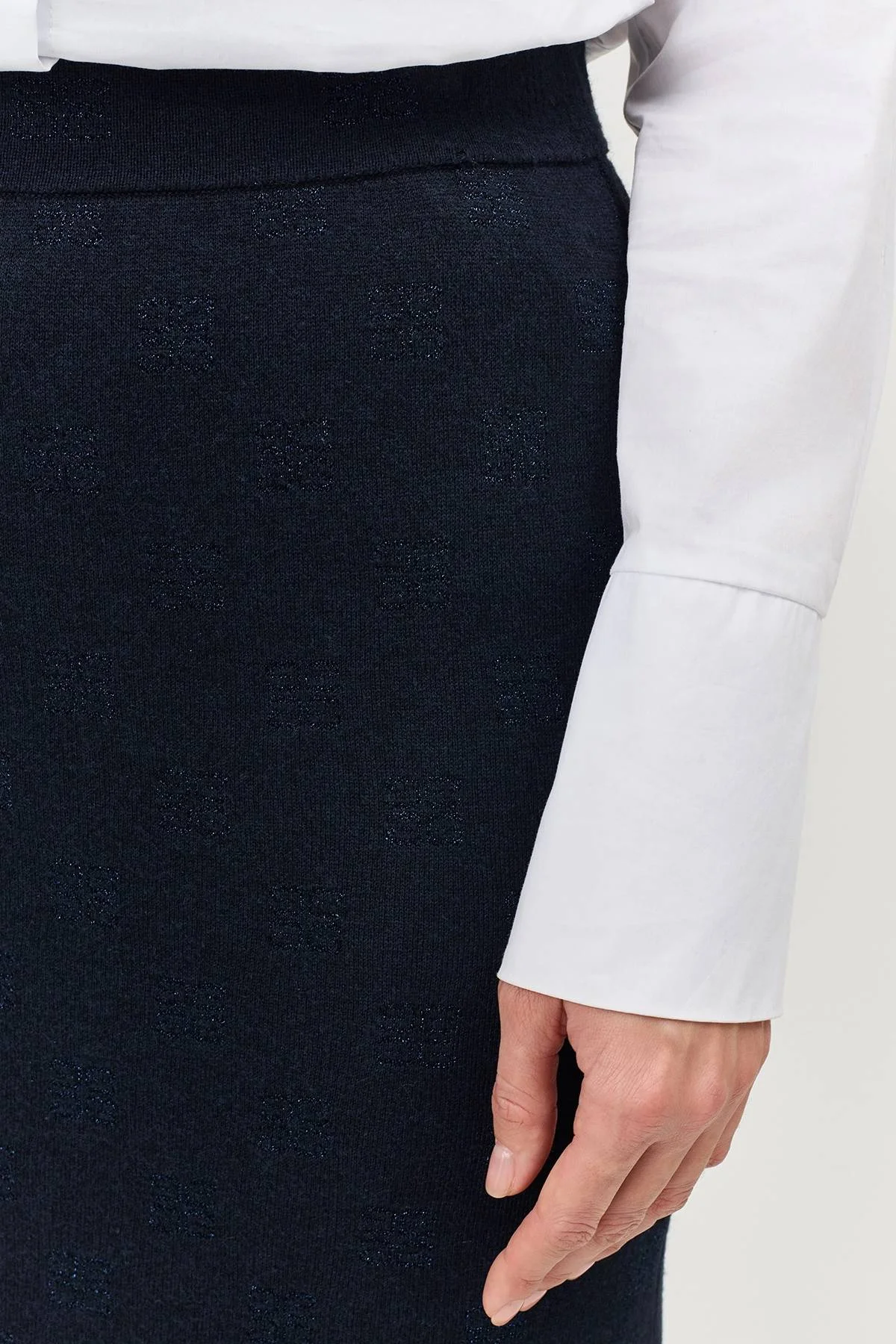 Жакардовая вязаная юбка с блеском. Прямой силуэт. Длина миди. Резинка по линии талии. Высокий разрез в боковом шве. В составе вискоза и шерсть.
