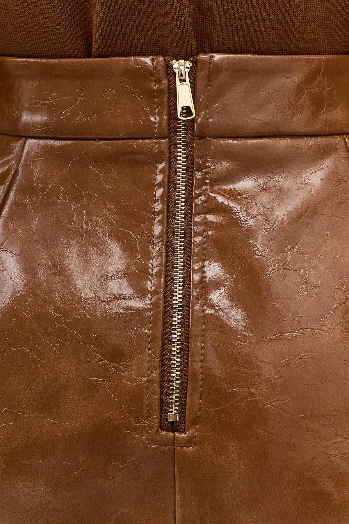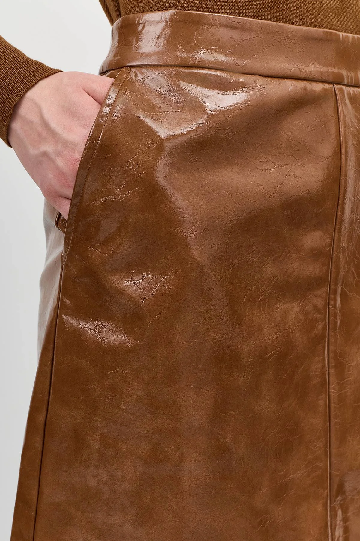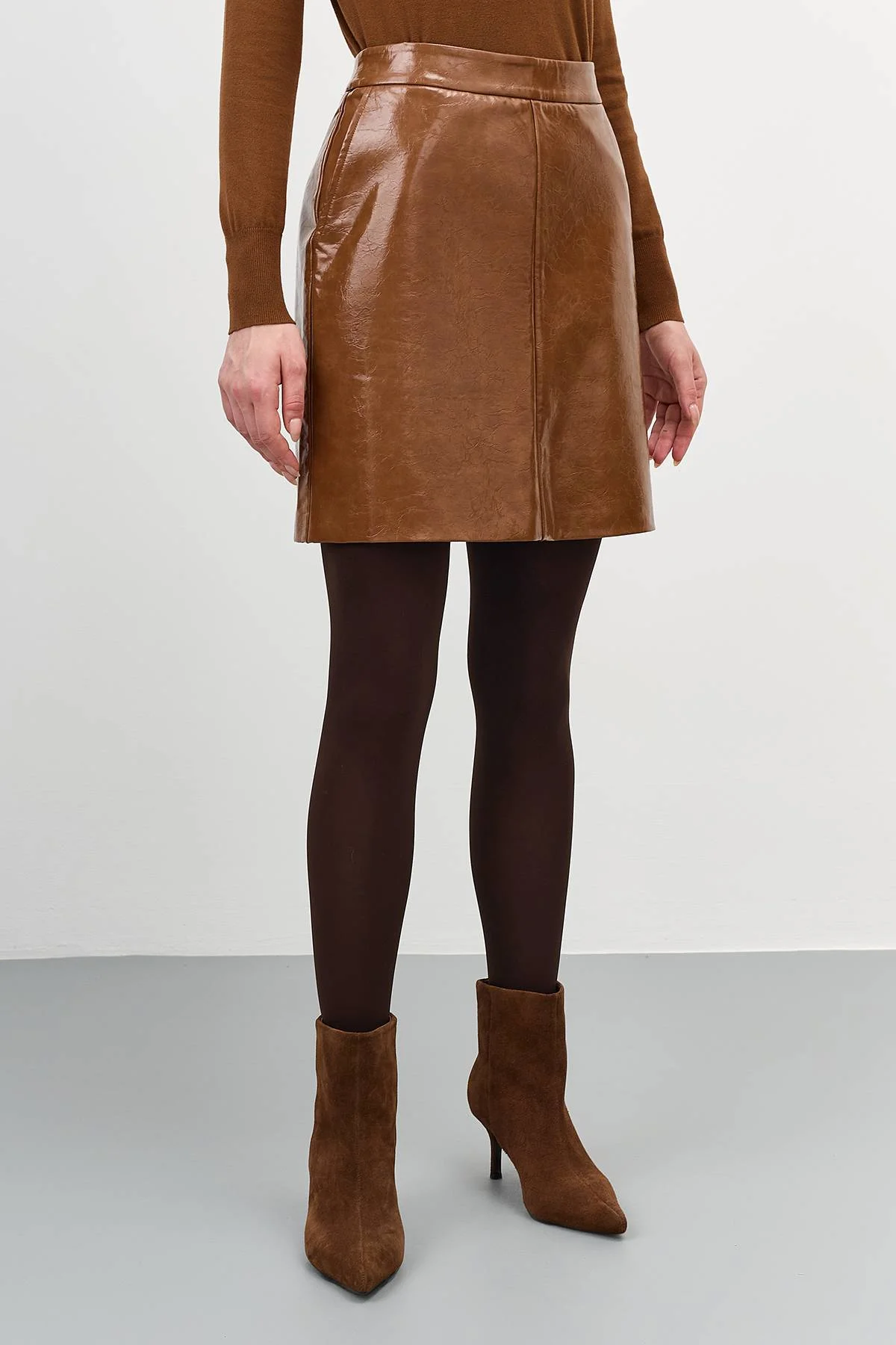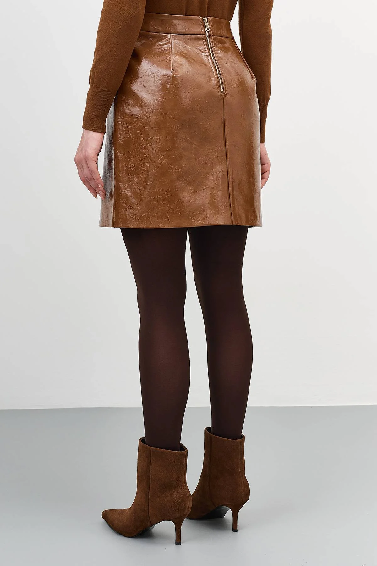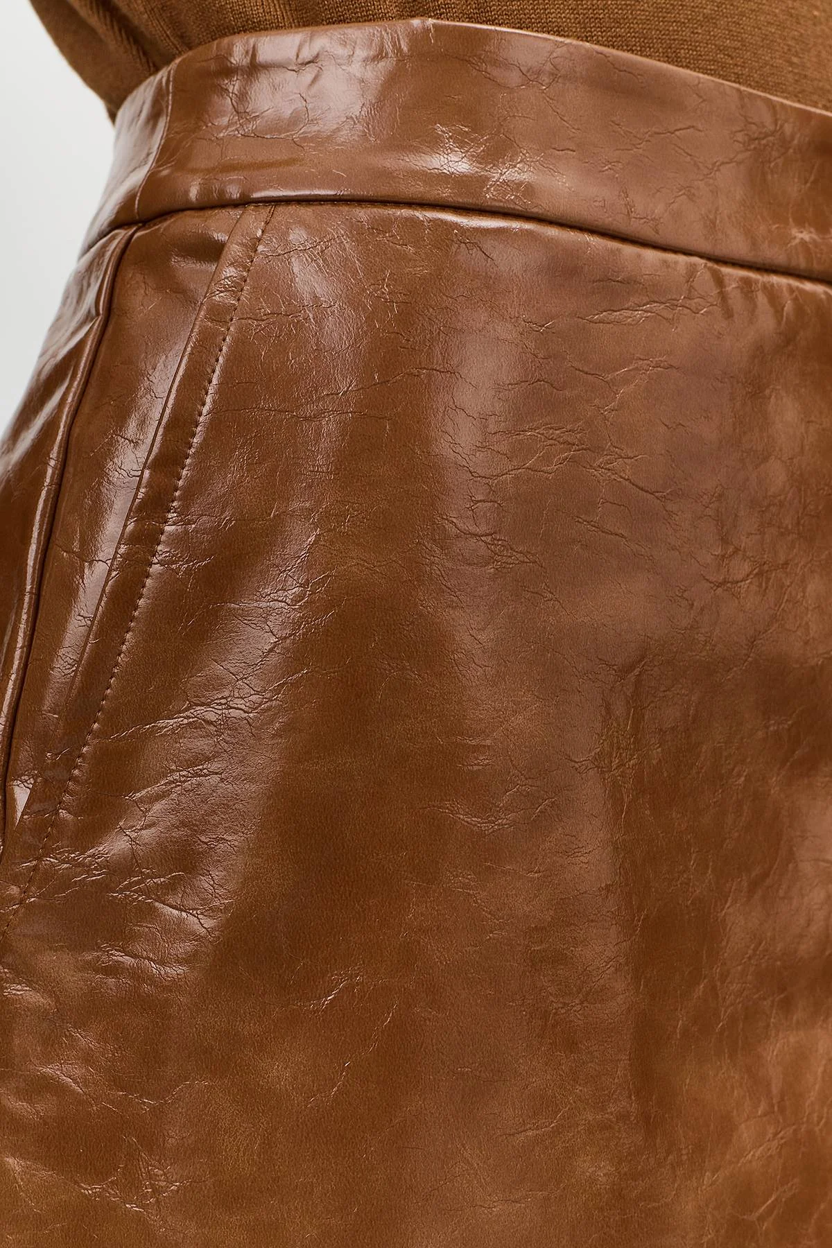 Мини-юбка из фактурной глянцевой экокожи. Прямой силуэт. Застежка на молнию. Боковые карманы в швах.