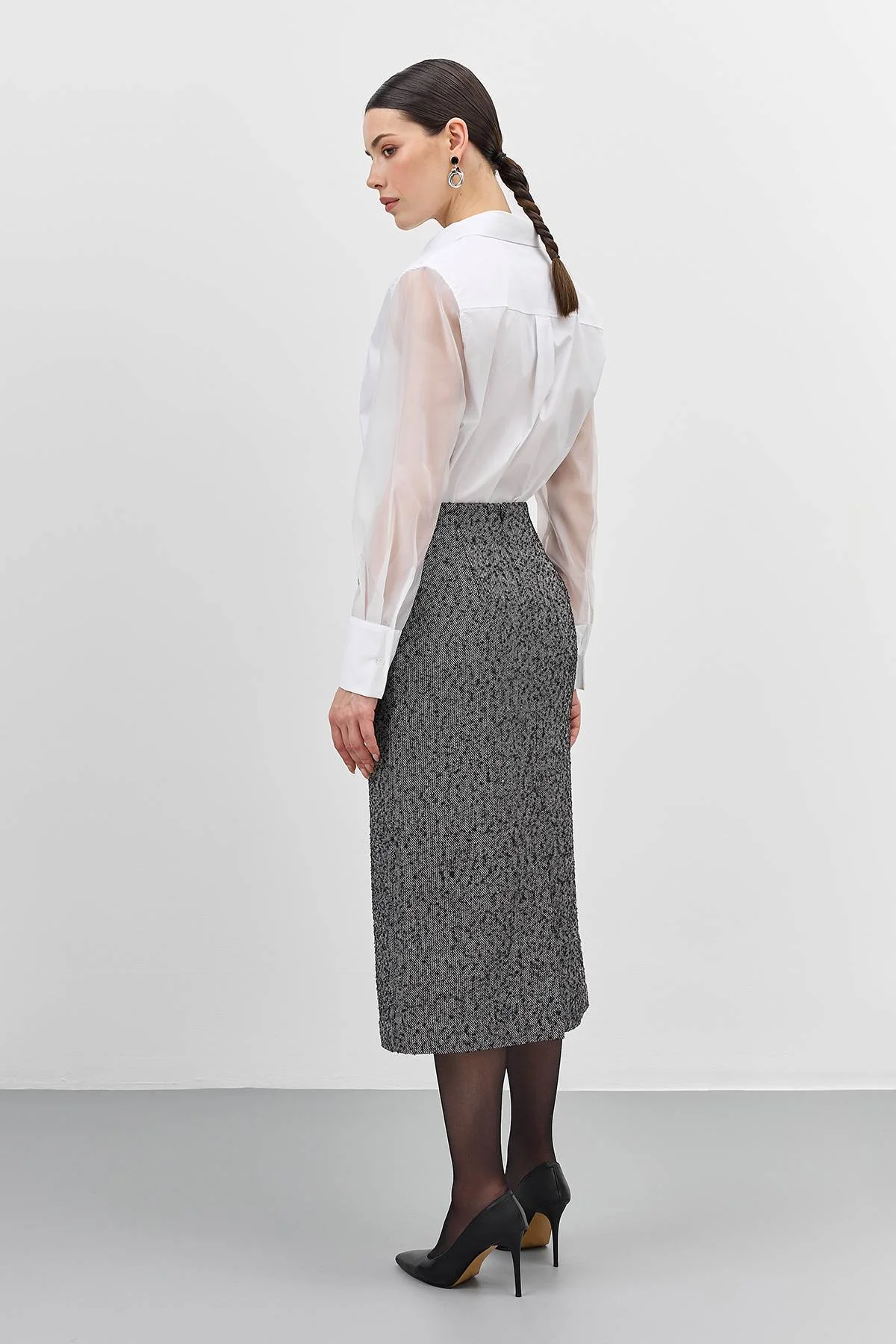 Прямая юбка из твида с эффектом ''букле''. Длина миди. Застежка на потайную молнию. Боковые карманы на контрастной молнии. Дополнена высоким разрезом сзади. Комплект с арт. 60313.