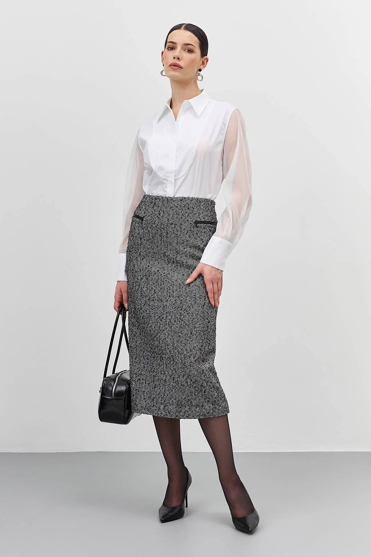 Прямая юбка из твида с эффектом ''букле''. Длина миди. Застежка на потайную молнию. Боковые карманы на контрастной молнии. Дополнена высоким разрезом сзади. Комплект с арт. 60313.