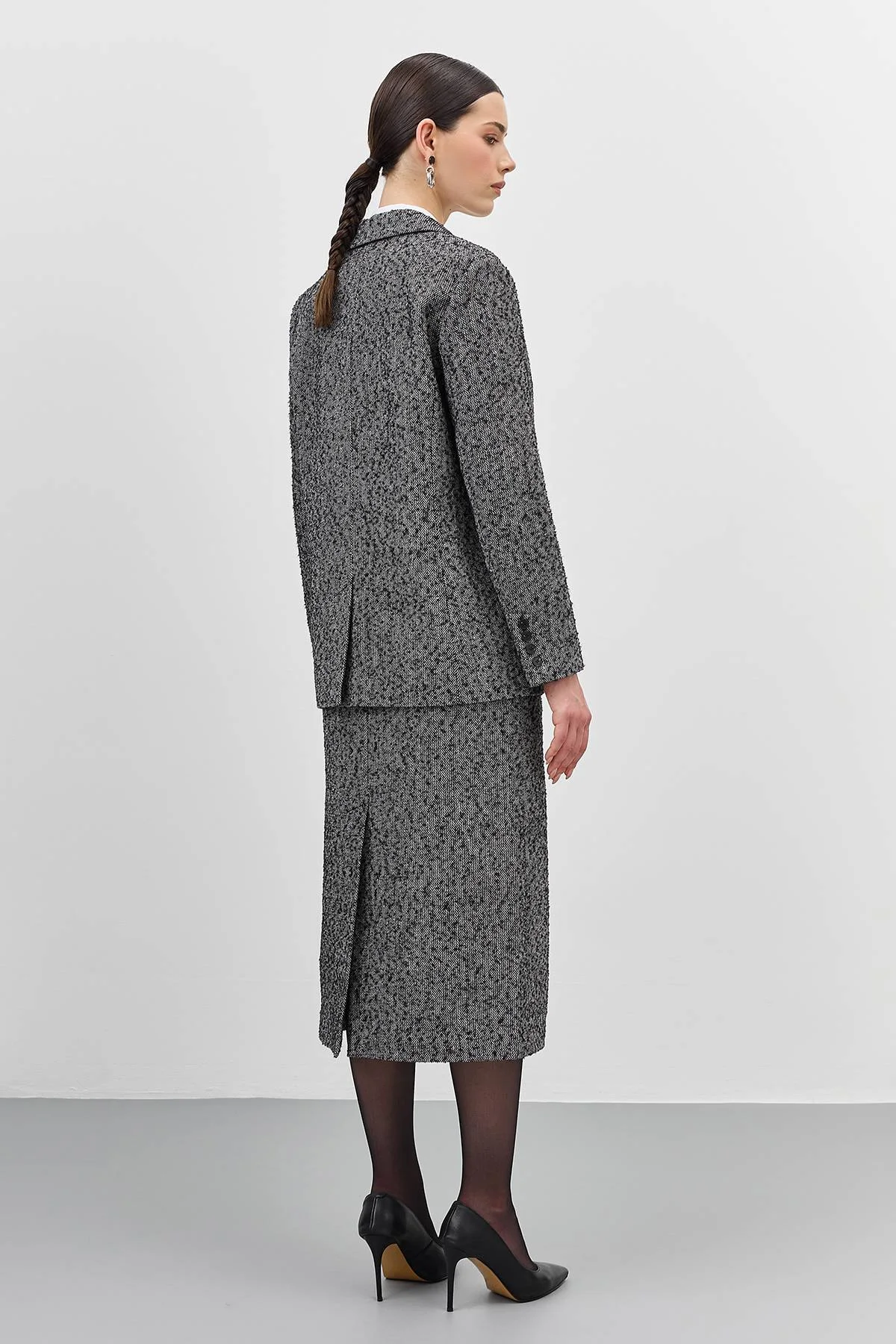 Прямая юбка из твида с эффектом ''букле''. Длина миди. Застежка на потайную молнию. Боковые карманы на контрастной молнии. Дополнена высоким разрезом сзади. Комплект с арт. 60313.