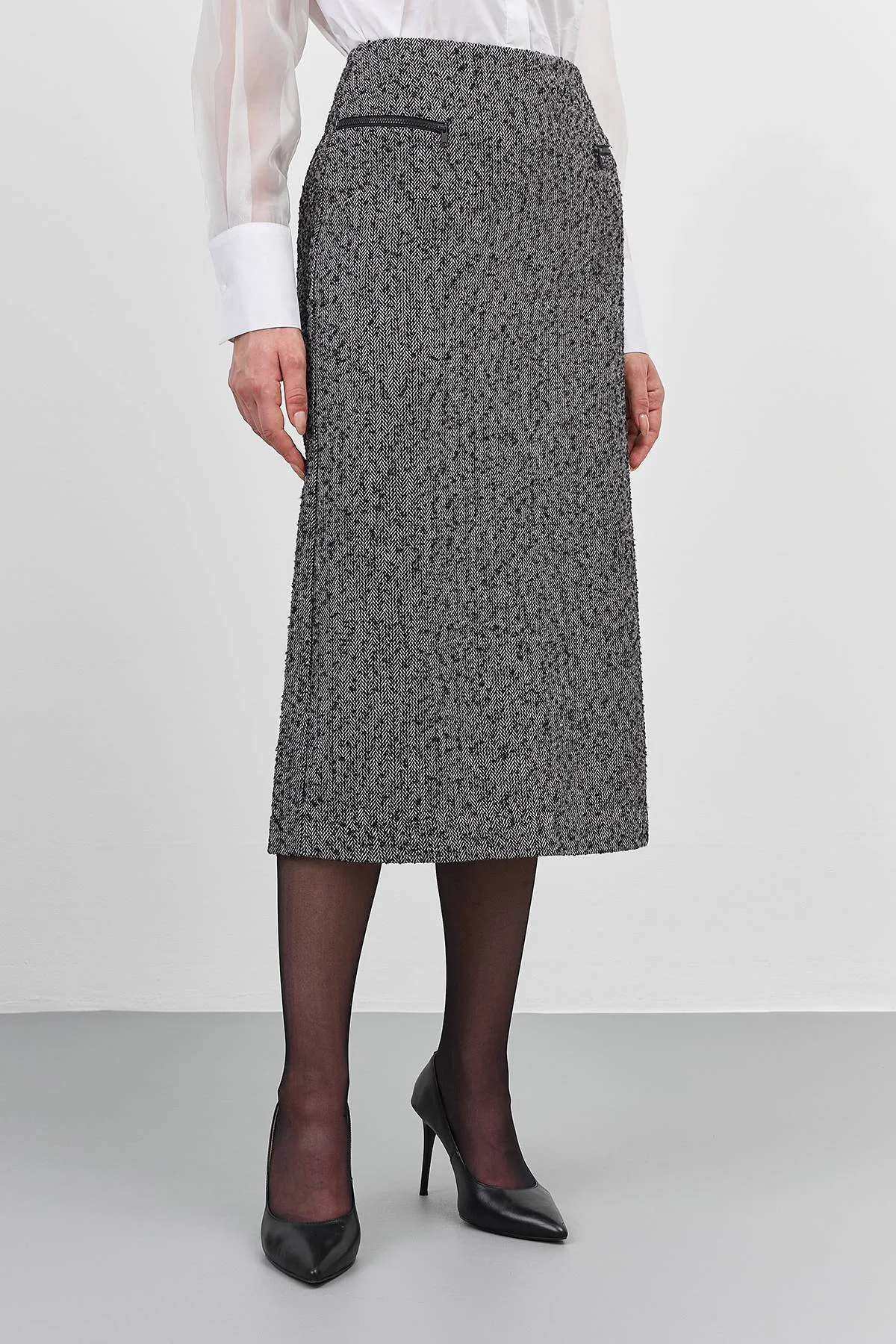 Прямая юбка из твида с эффектом ''букле''. Длина миди. Застежка на потайную молнию. Боковые карманы на контрастной молнии. Дополнена высоким разрезом сзади. Комплект с арт. 60313.
