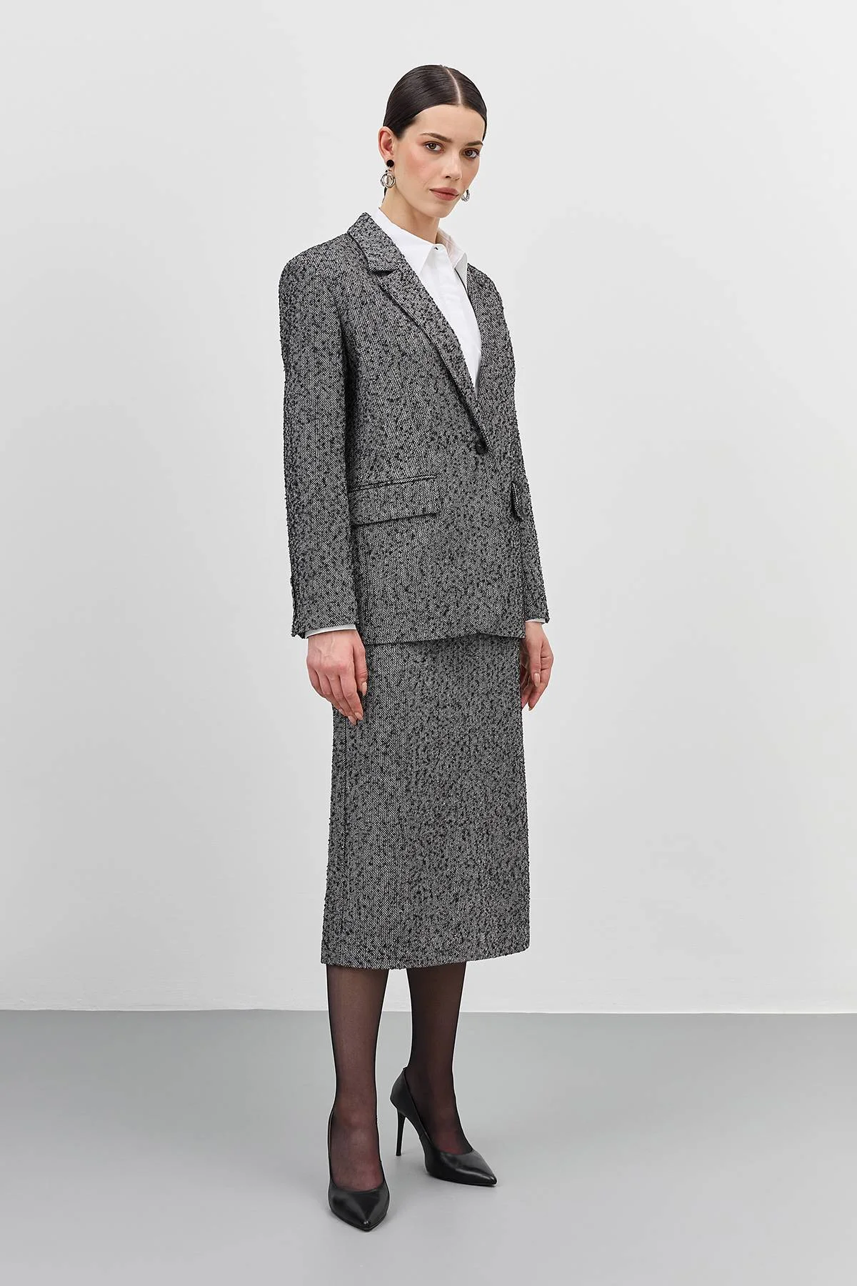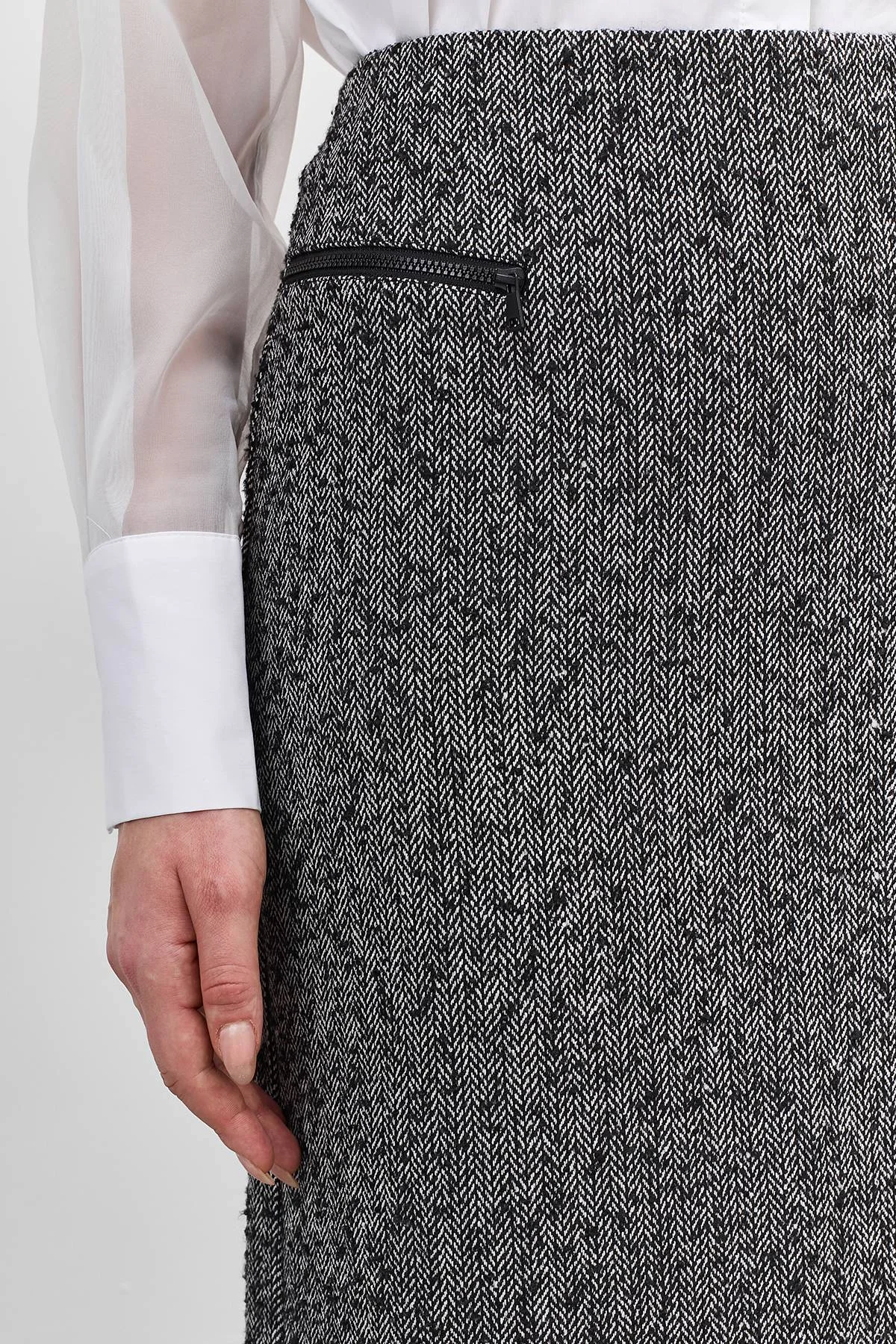 Прямая юбка из твида с эффектом ''букле''. Длина миди. Застежка на потайную молнию. Боковые карманы на контрастной молнии. Дополнена высоким разрезом сзади. Комплект с арт. 60313.