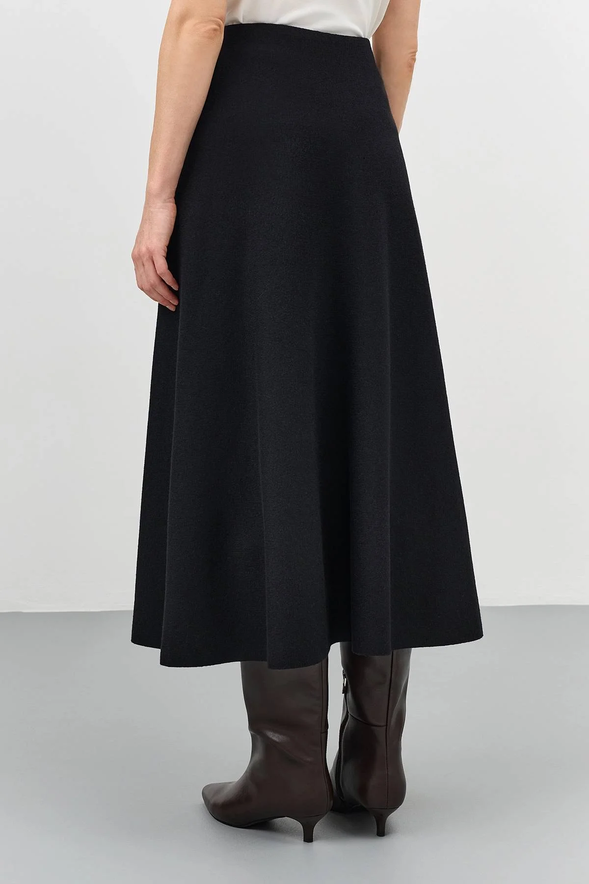 Трикотажная юбка-миди А-силуэта. Резинка по линии талии. В составе вискоза и шерсть.